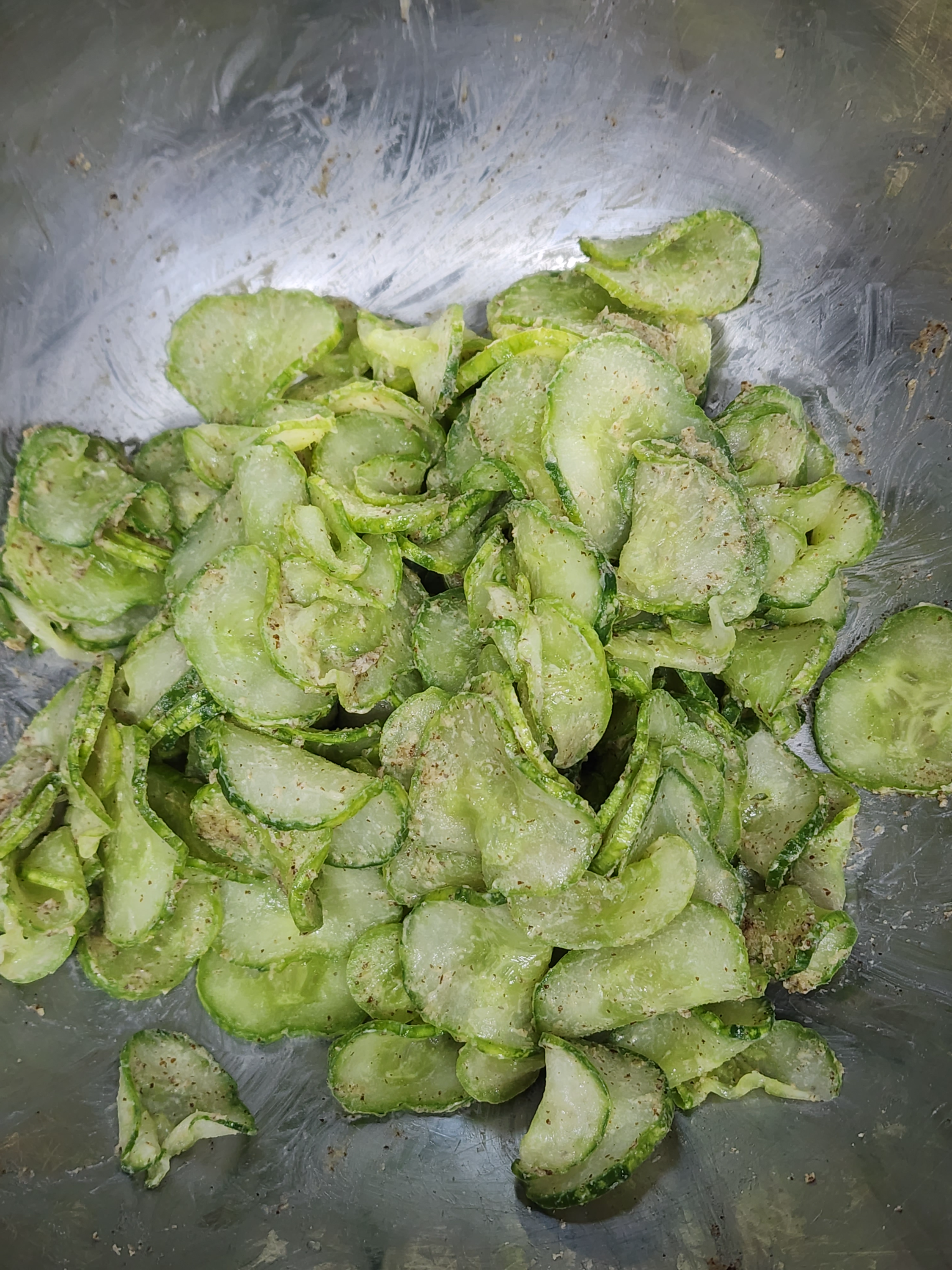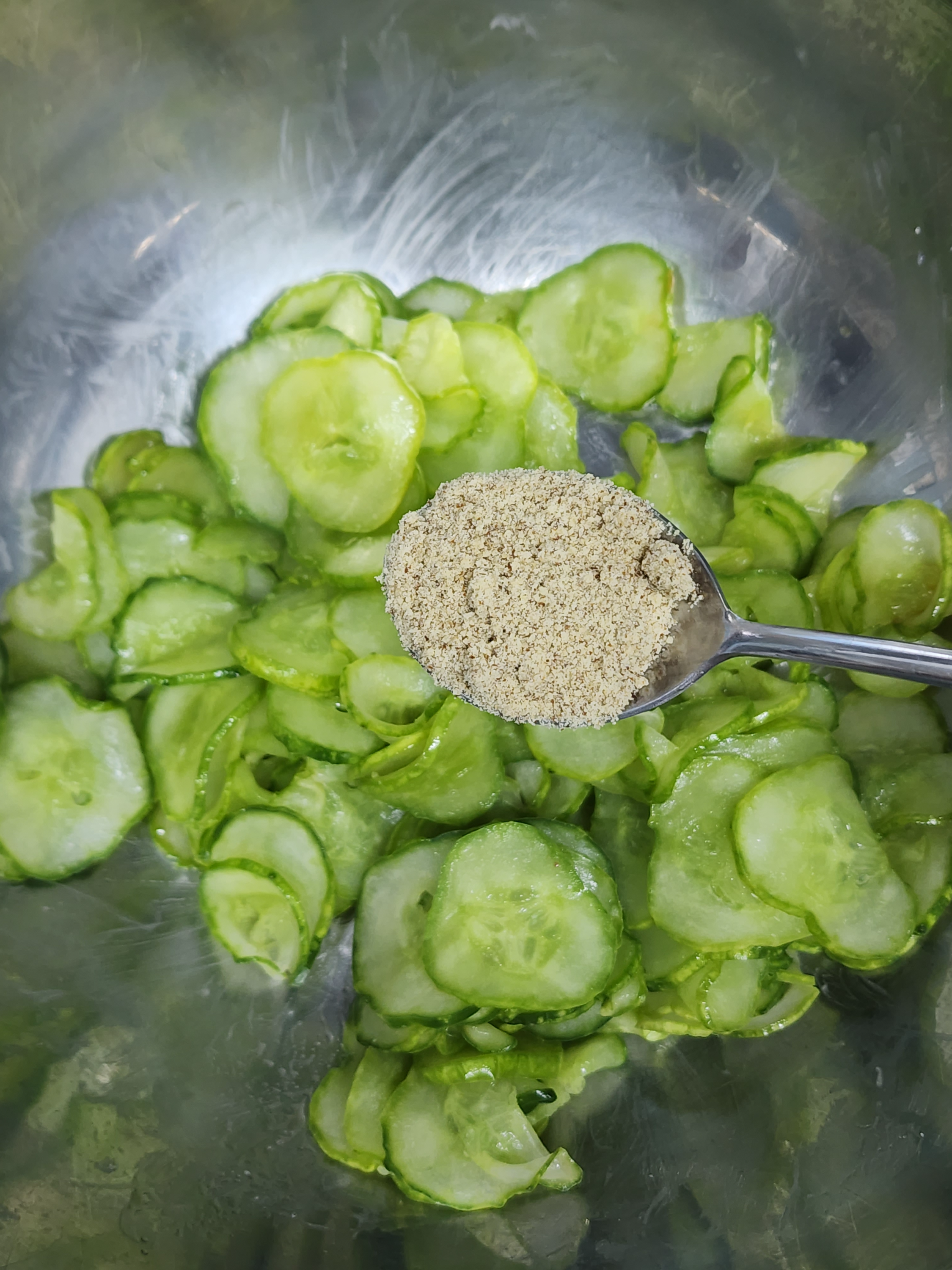 5. 무쳐진 오이에 들깻가루 2T를 넣고 조물조물 무쳐주세요.