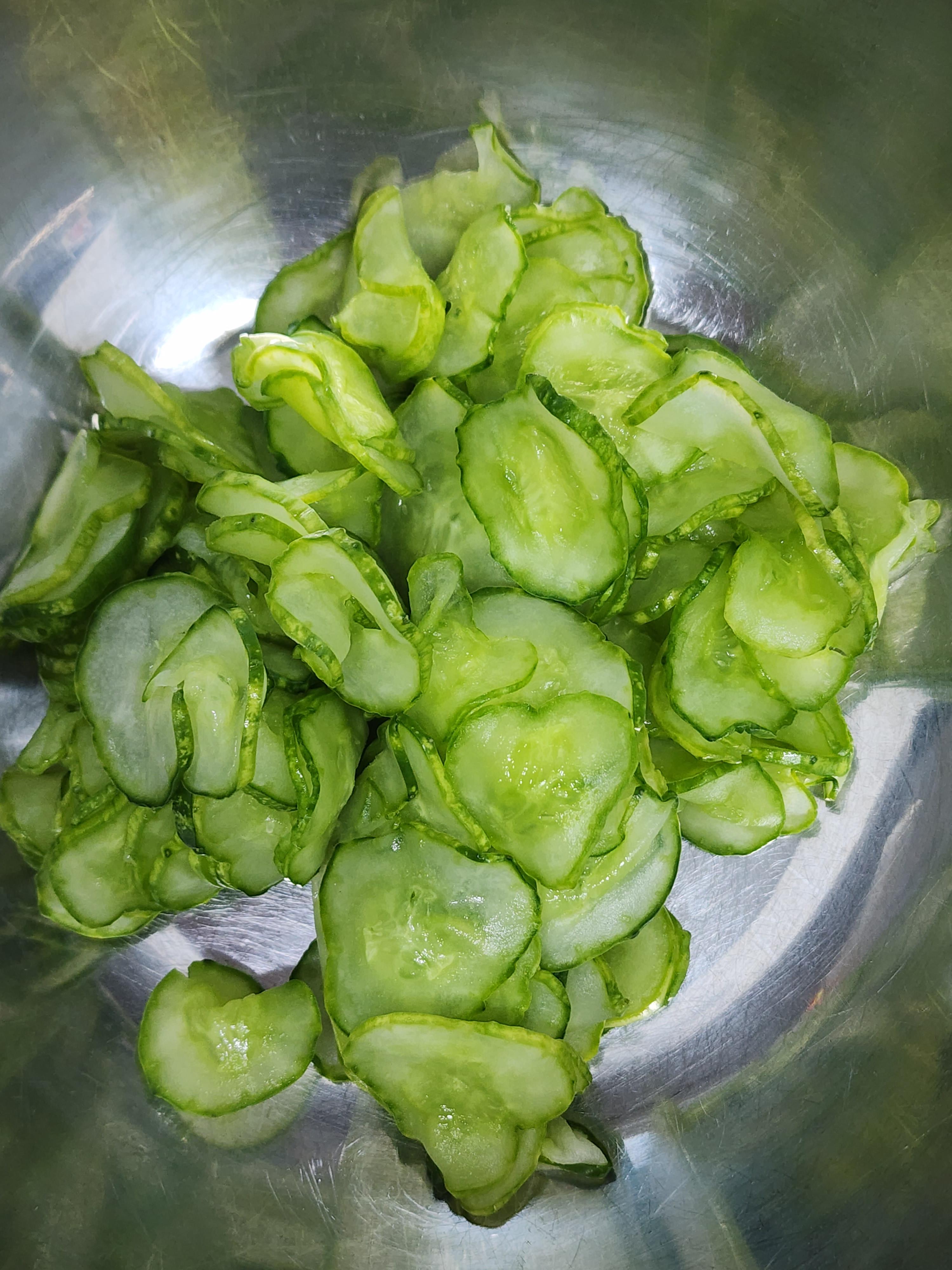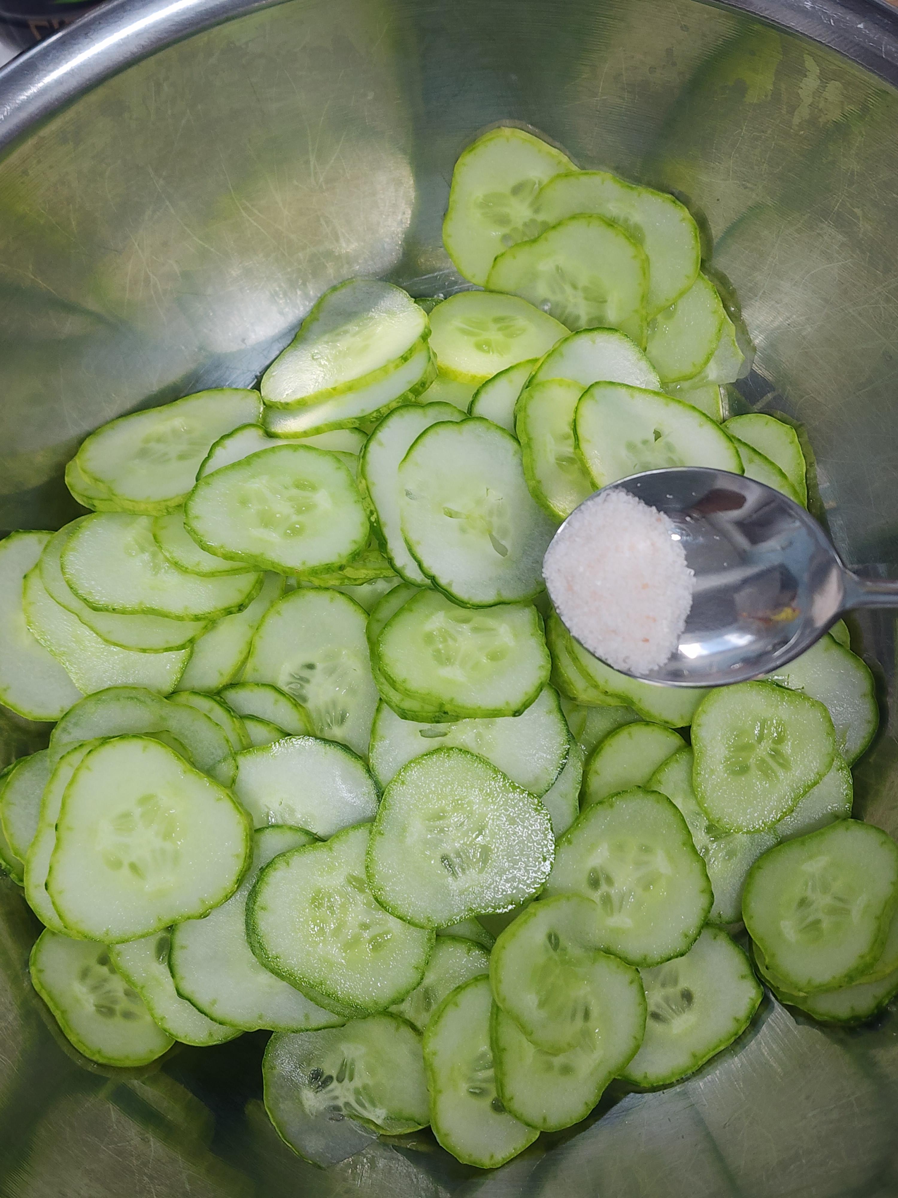 2. 슬라이스 한 오이를 볼에 담고 소금 1/3T를 넣고 20분간 절여주세요.