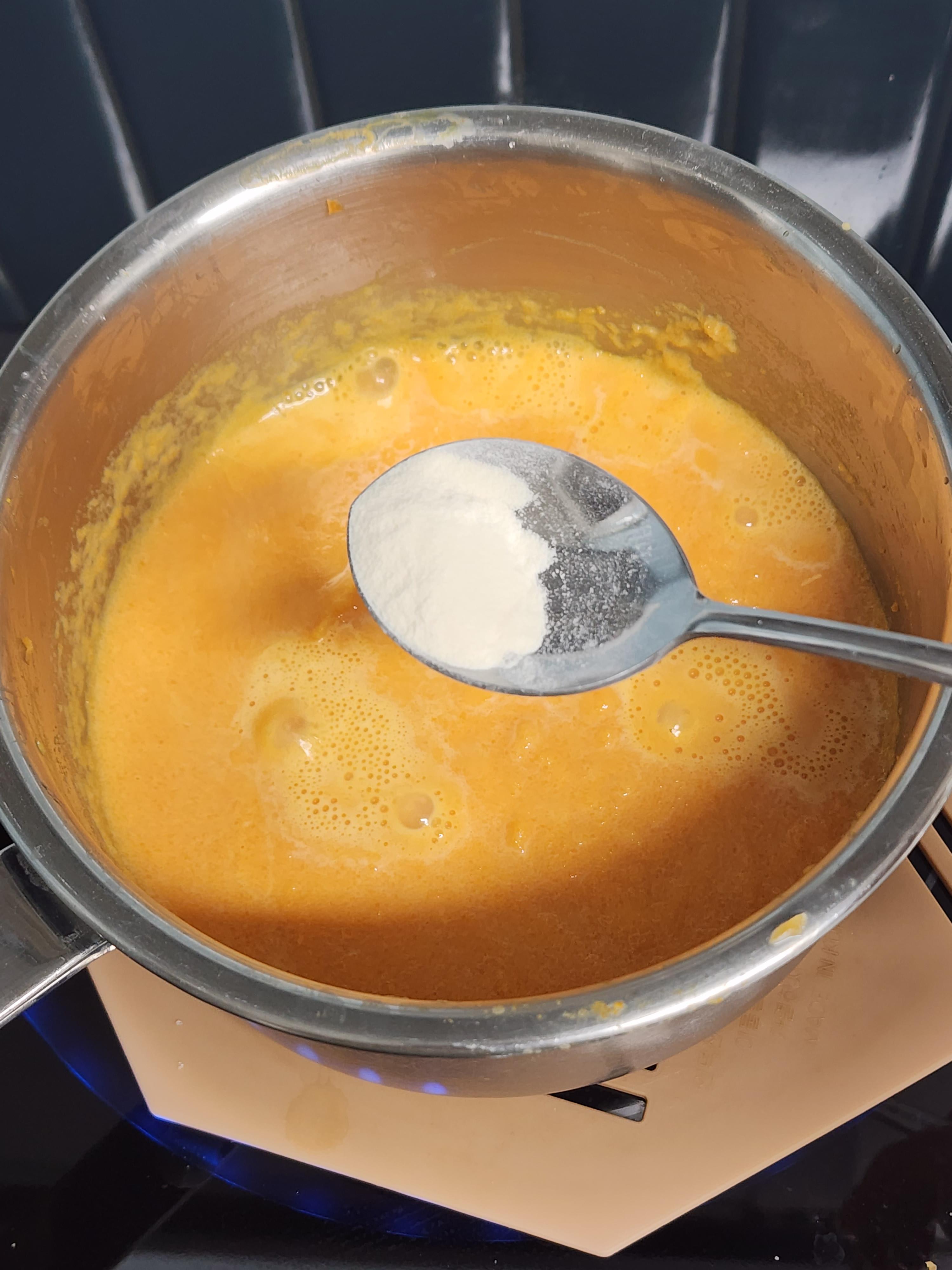 5. 곱게 간 당근을 다시 팬에 옮겨주고 한천가루 0.7~1T 정도 나눠서 넣어주세요.