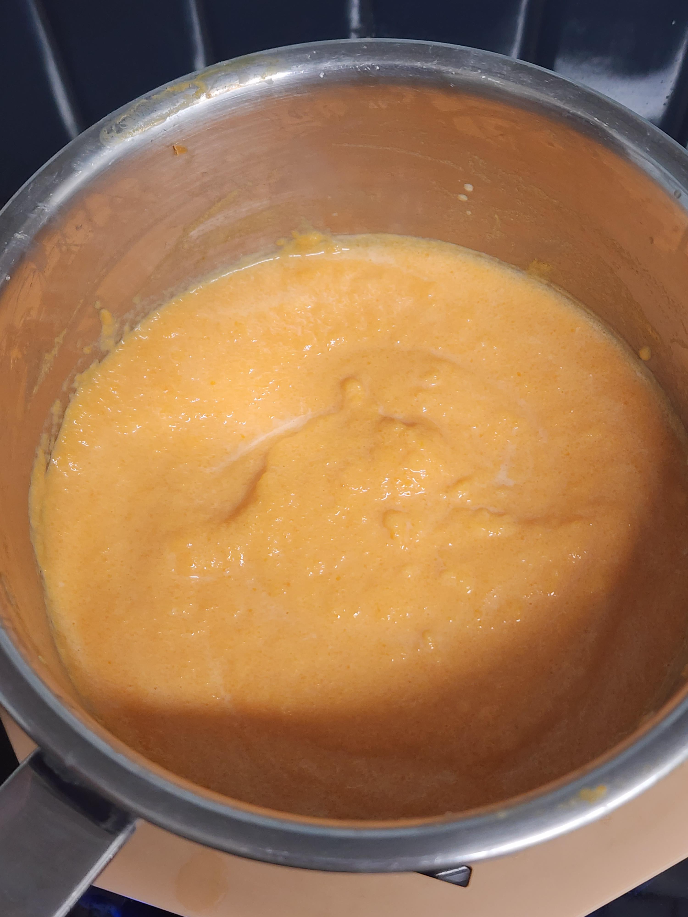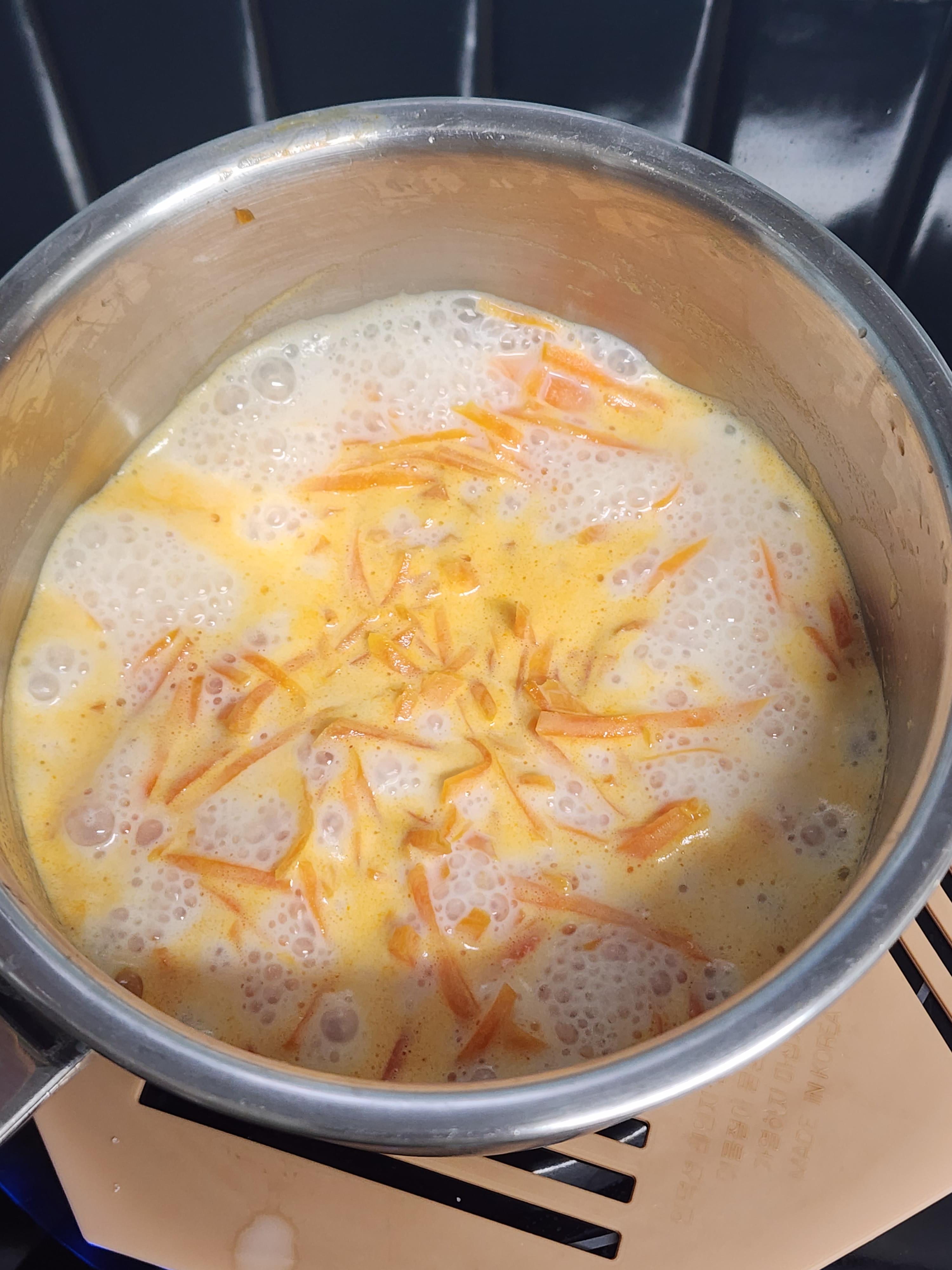 3. 볶은 당근에 우유 200ml를 넣고 한소끔 끓여주세요.