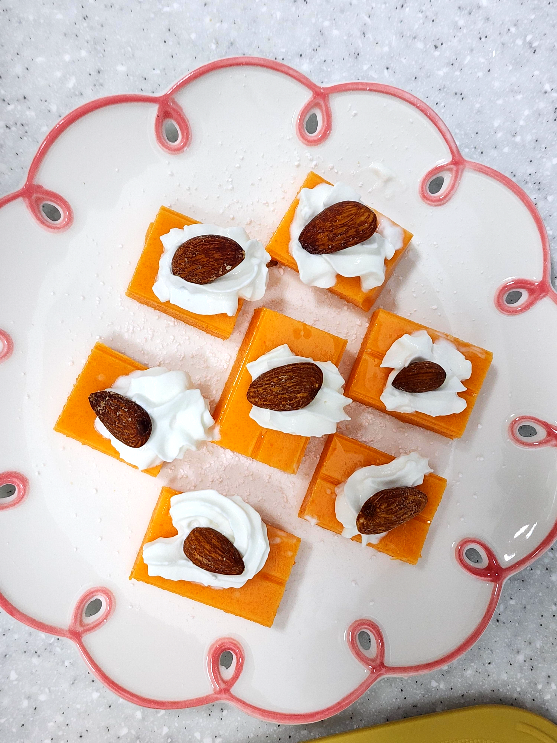 8. 양갱을 그릇에 옮겨주고 슈가파우더를 뿌리고 그 위에 생크림 아몬드를 올려주면 완성입니다.