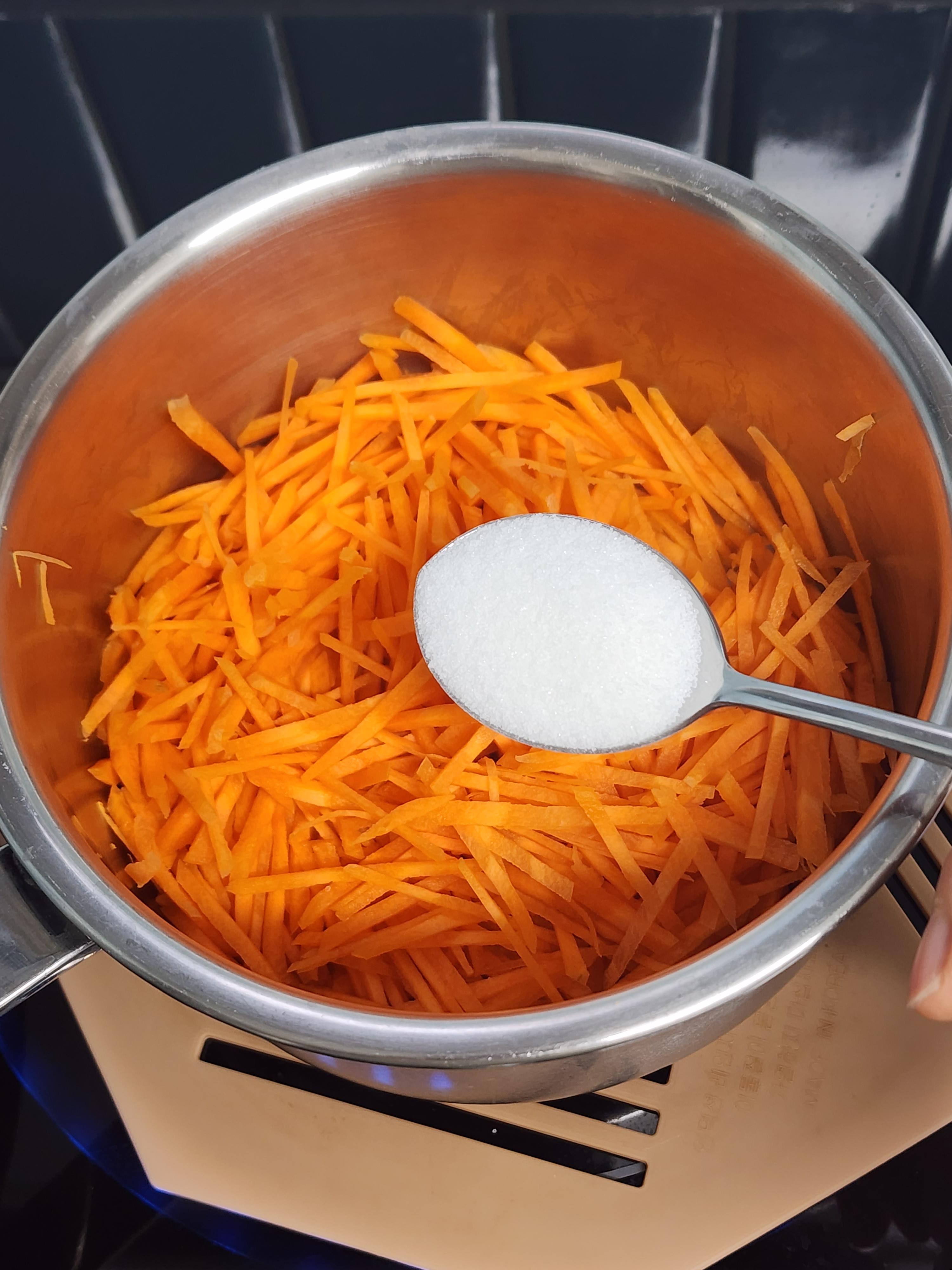2. 팬에 채썬당근과 설탕 5T를 넣고 중 약불에 당근에서 물이 나올 때까지 볶아줍니다.