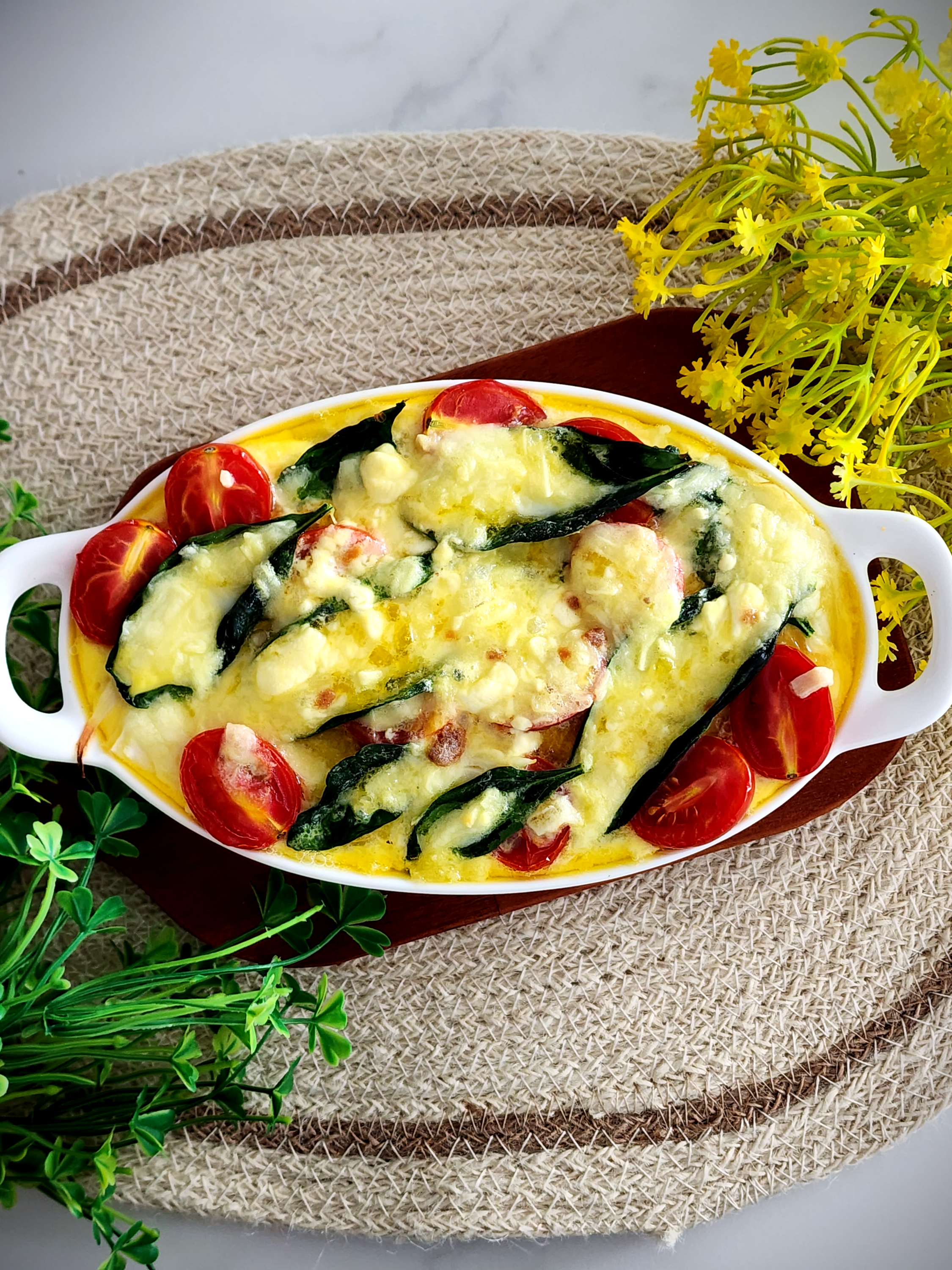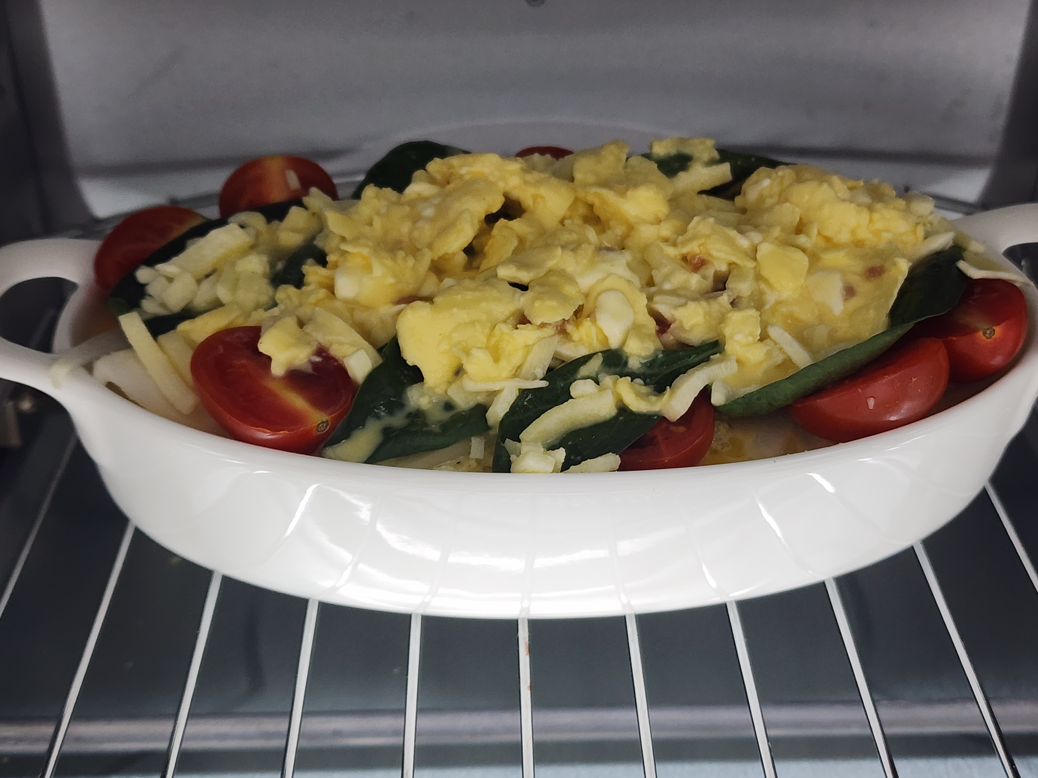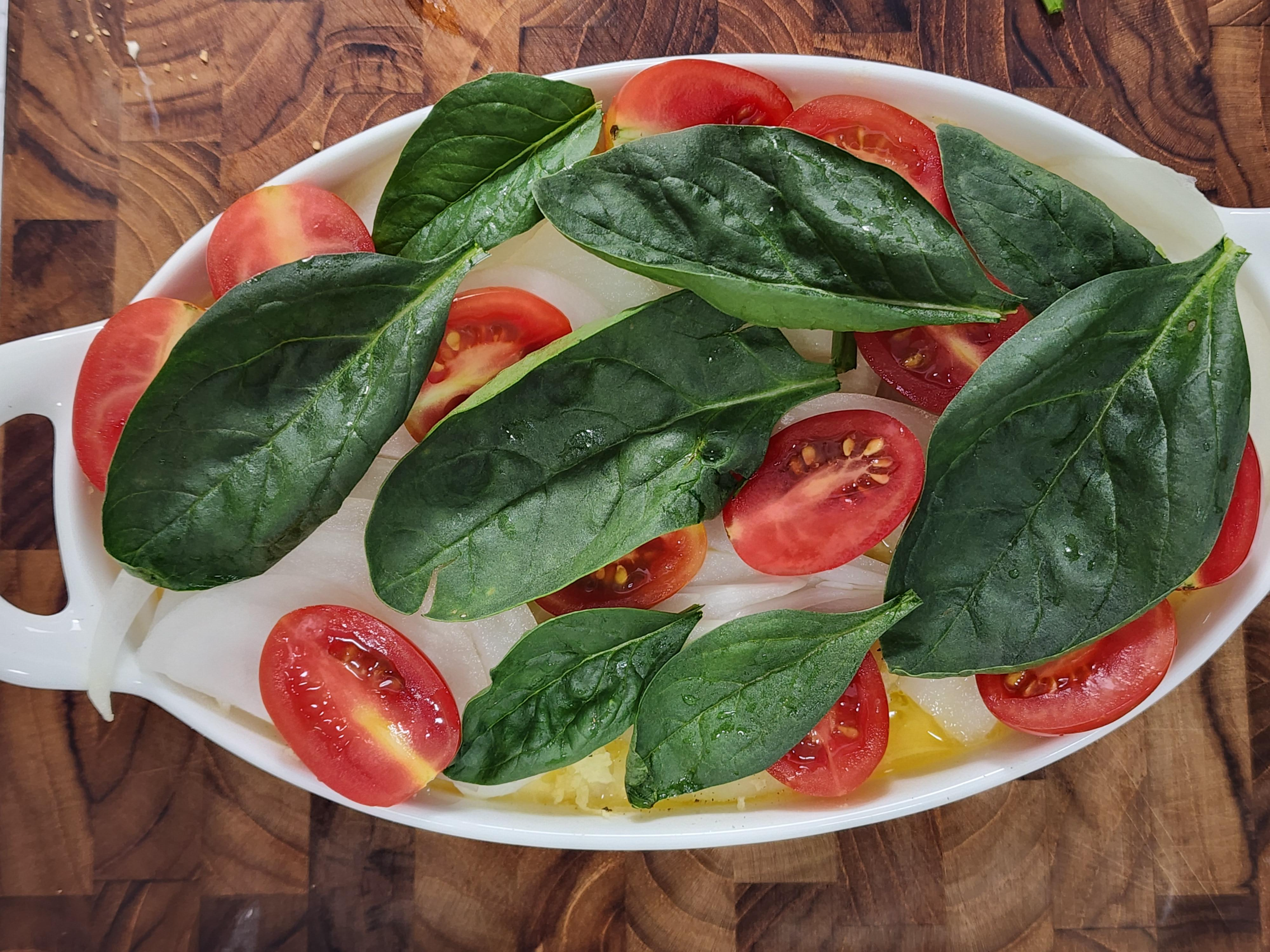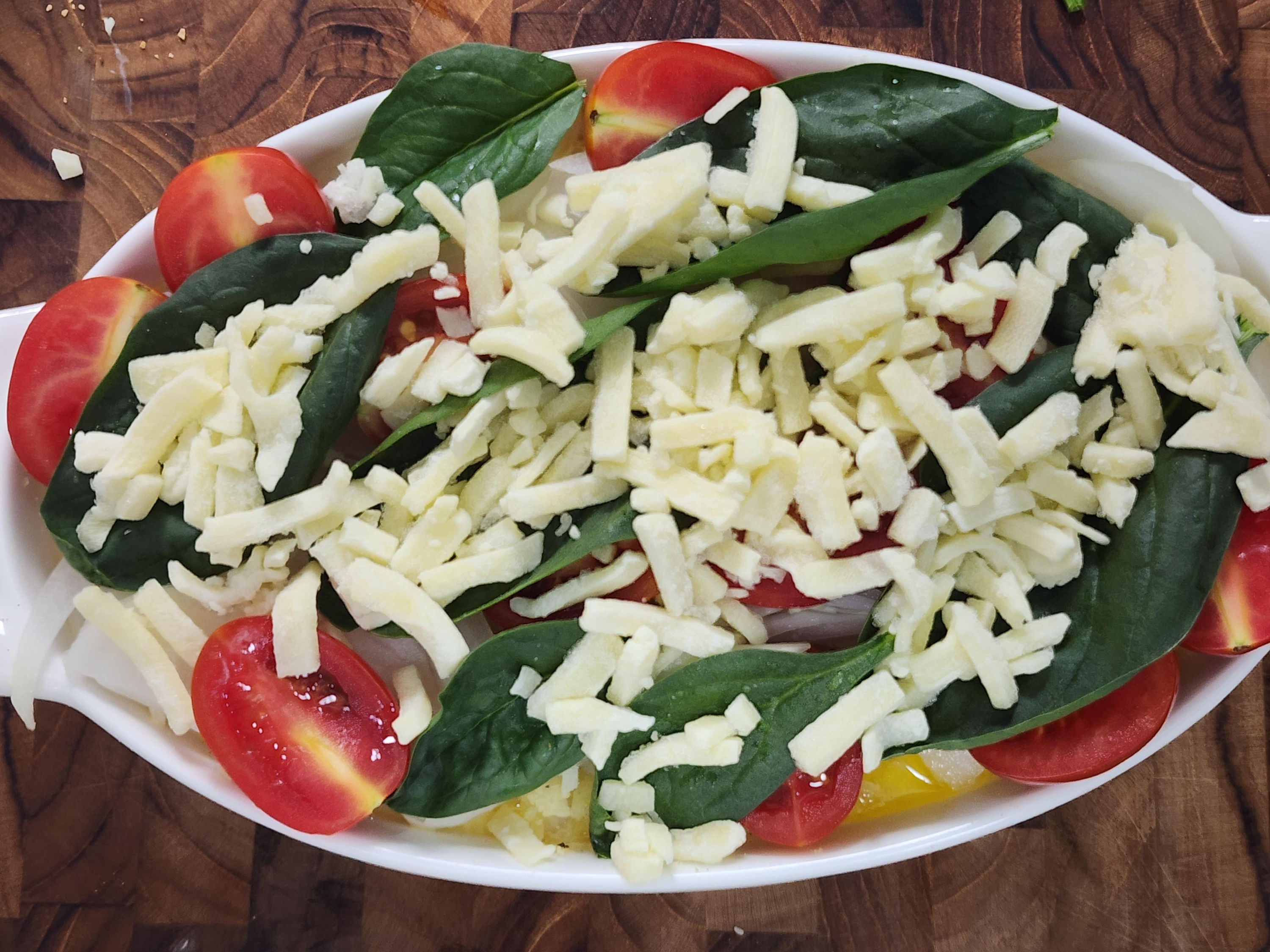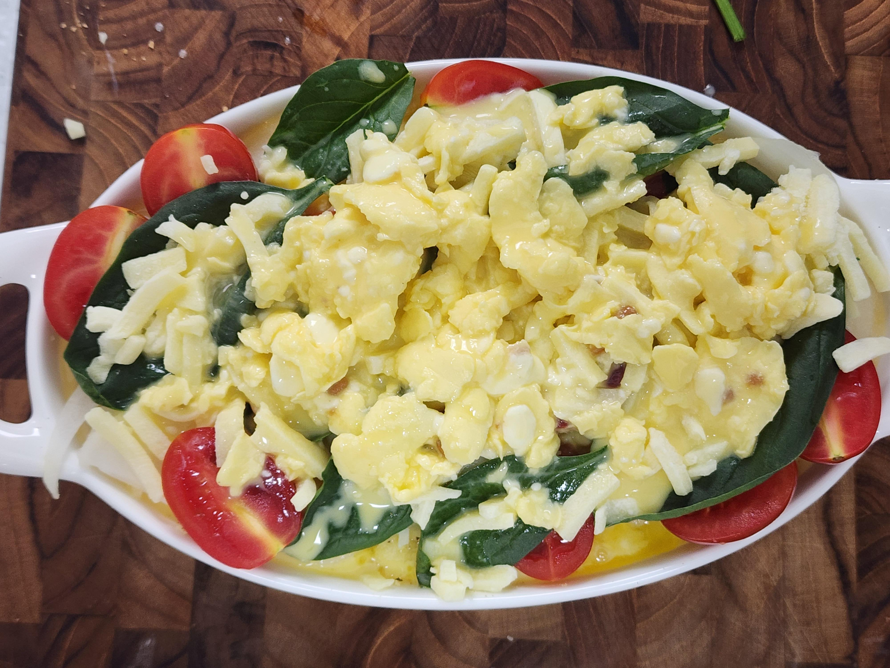 5. 감자 위에 만들어둔 계란소스를 약간 붓고 그 위에 양파, 방울토마토, 시금치, 모차렐라치즈를 올려주세요.