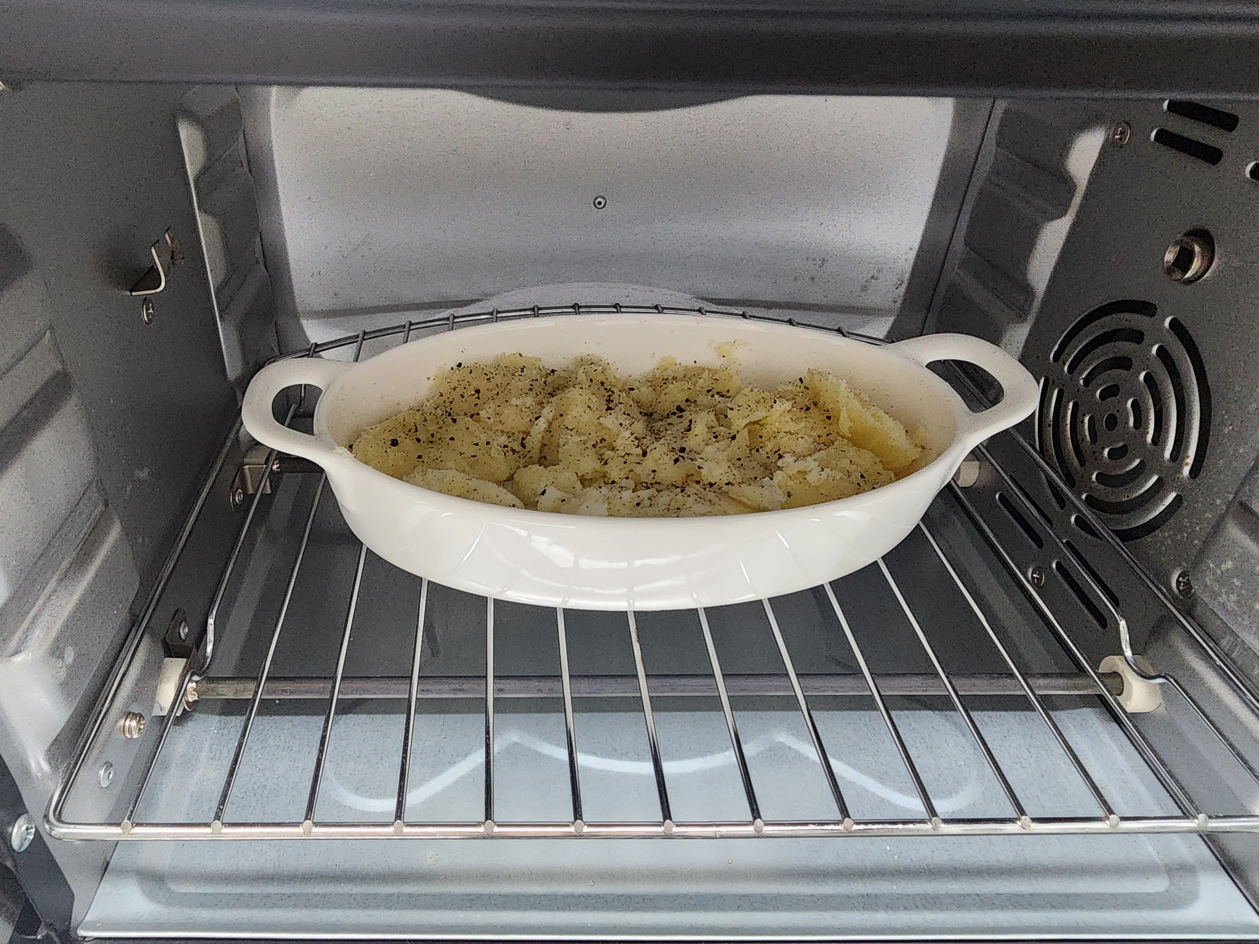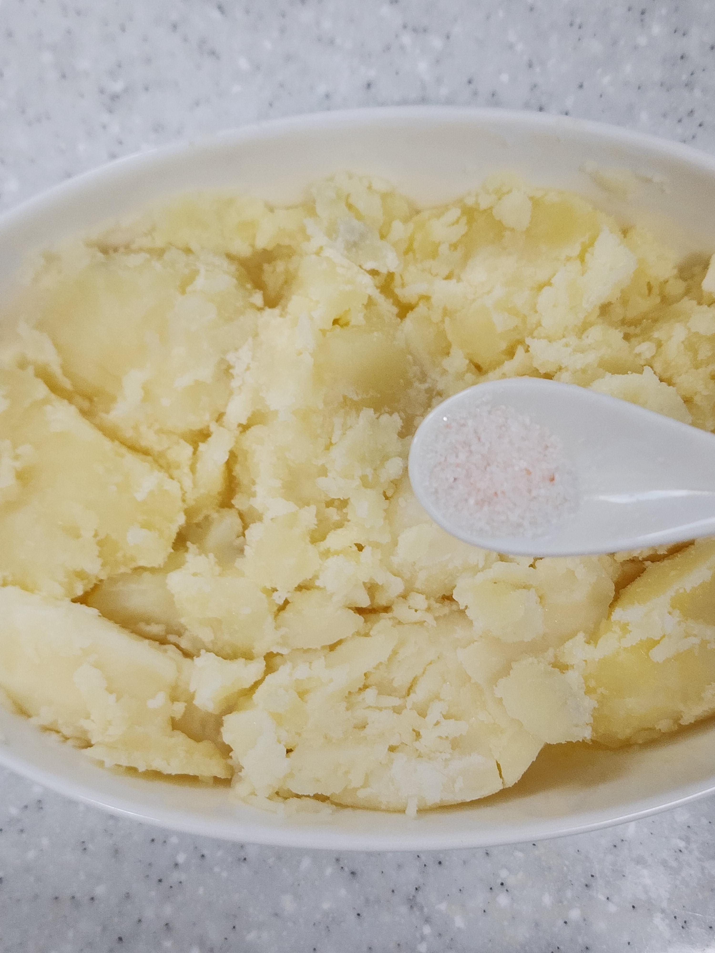 3. 으깬 감자에 소금, 후추, 올리브오일을 적당량 뿌리고 에어프라이어에 200도로 10간 구워주세요.