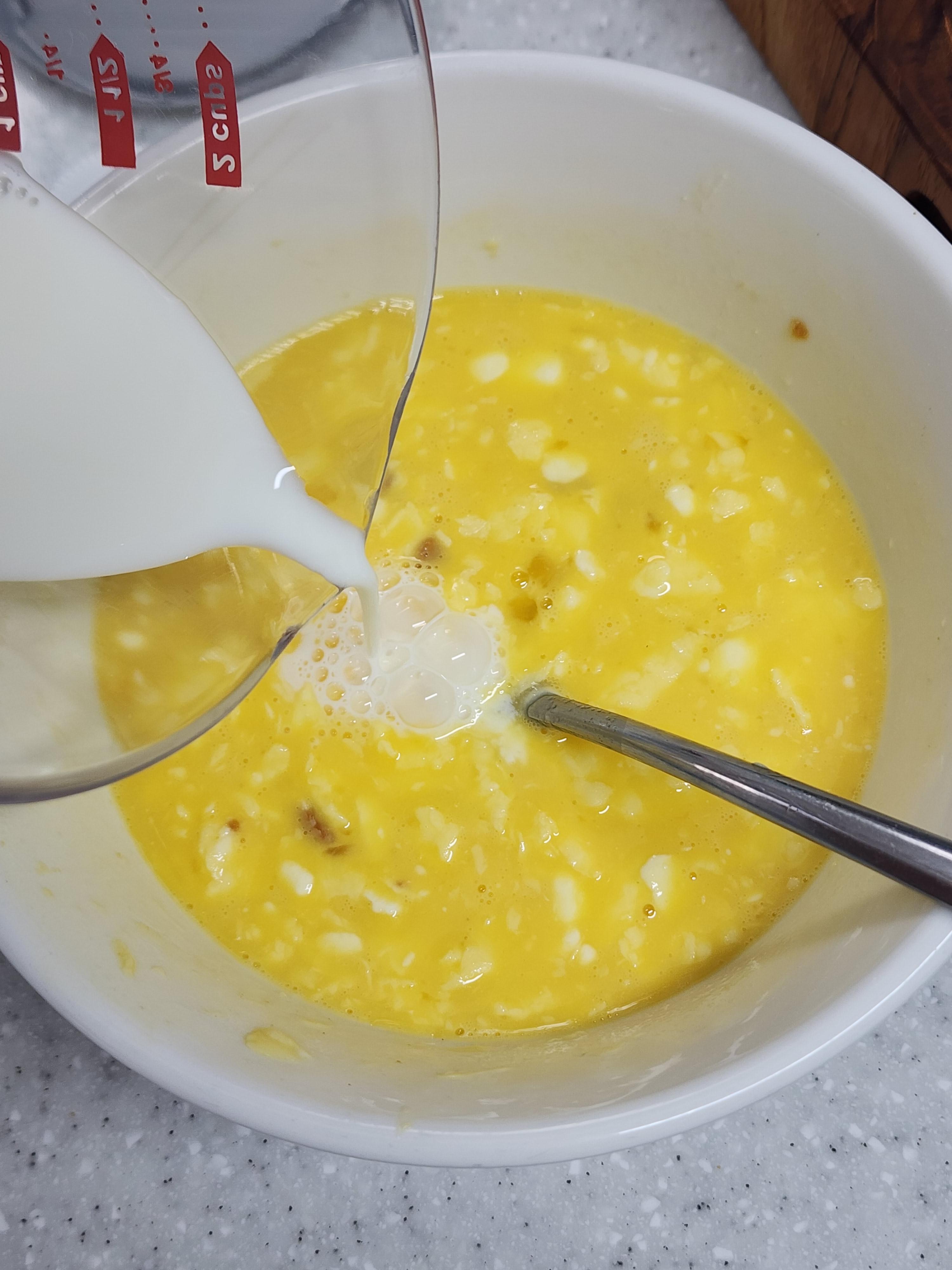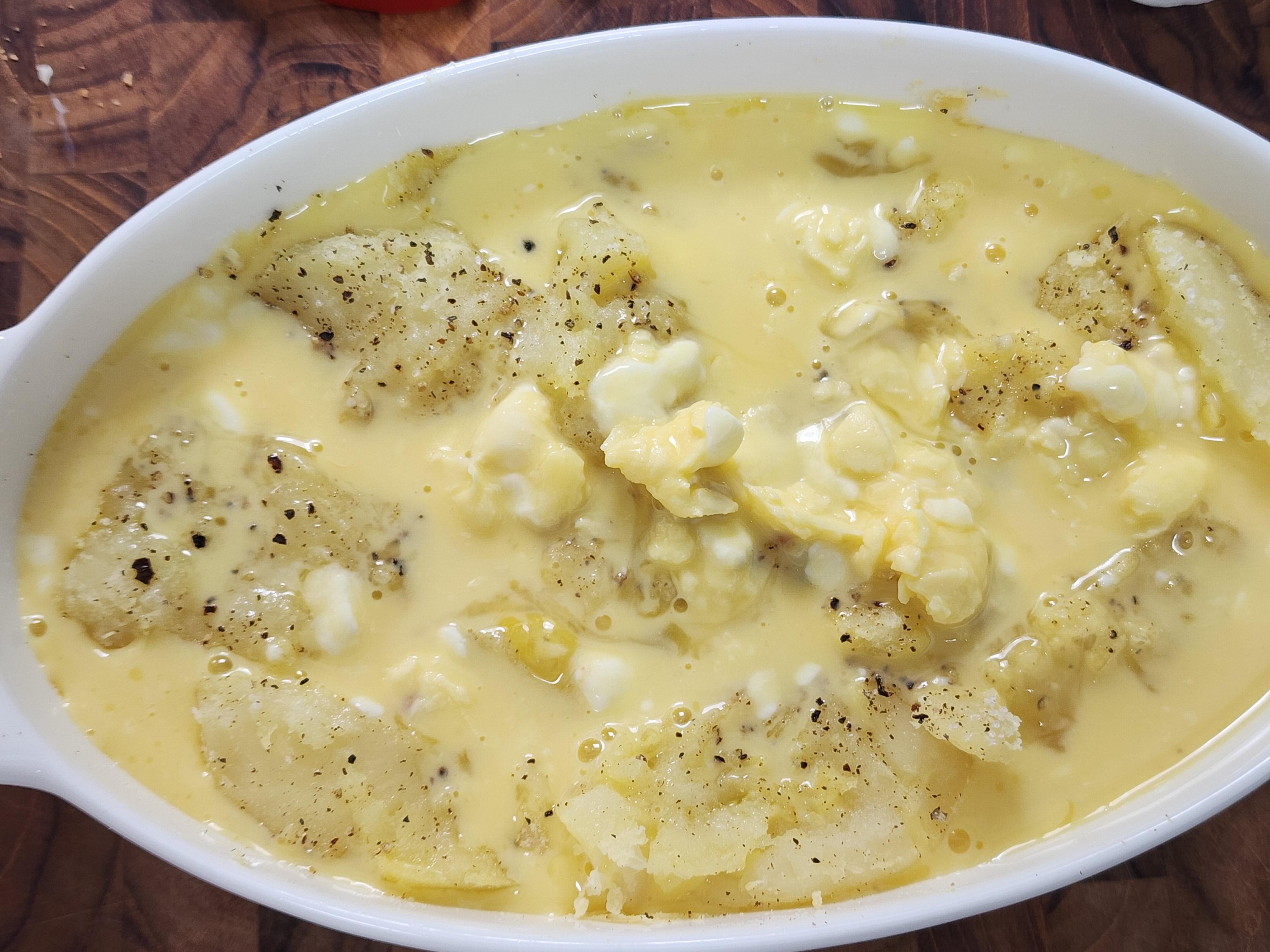 4. 감자가 구워질동안 그릇에 계란 3개, 버터 30g, 크림치즈 2T, 마늘가루 1/2T, 우유 50ml를 넣고 섞어주세요.