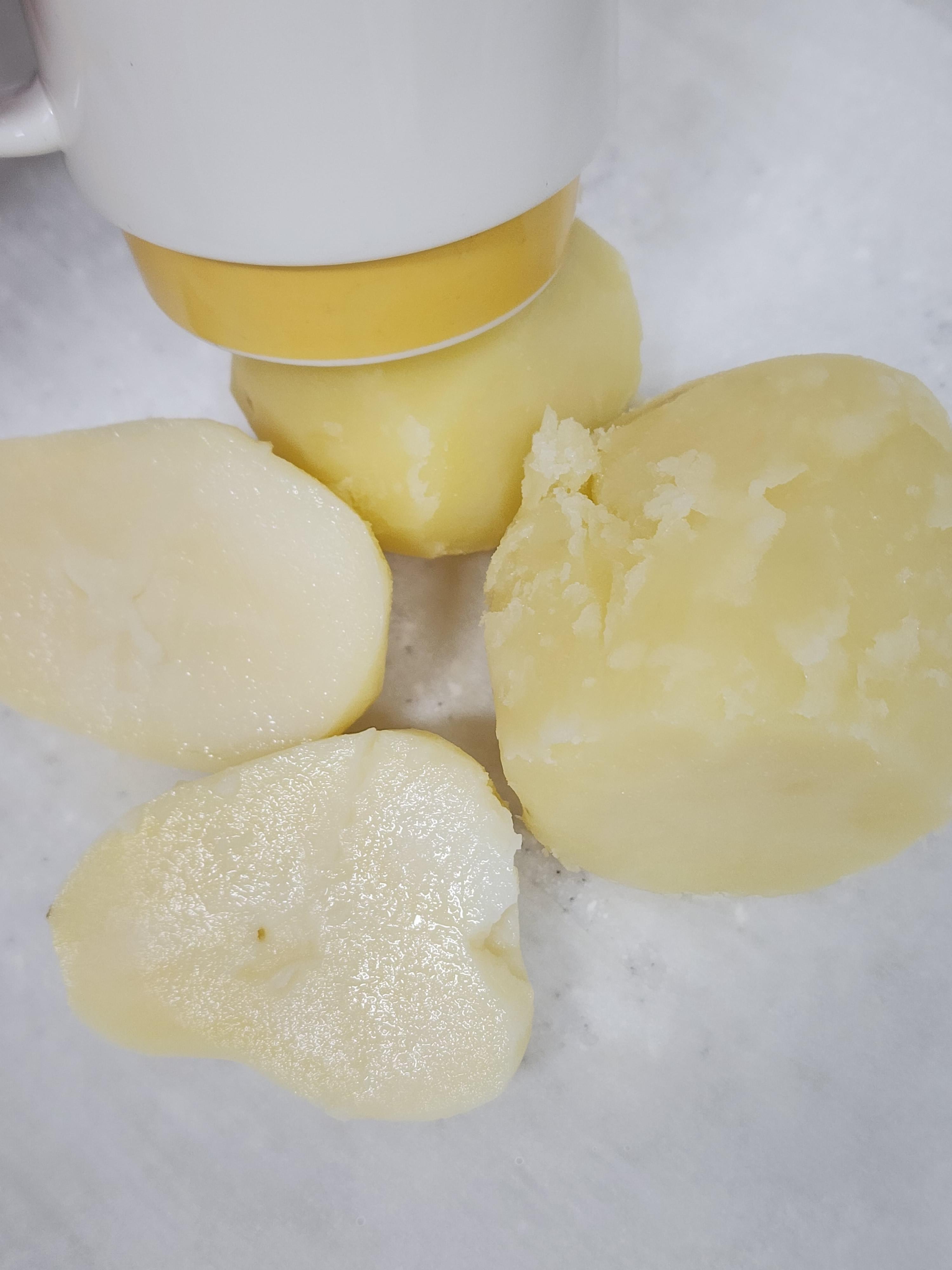 2. 삶은 감자를 내열용기에 담고 컵 밑면으로 눌러 으깨주세요.
