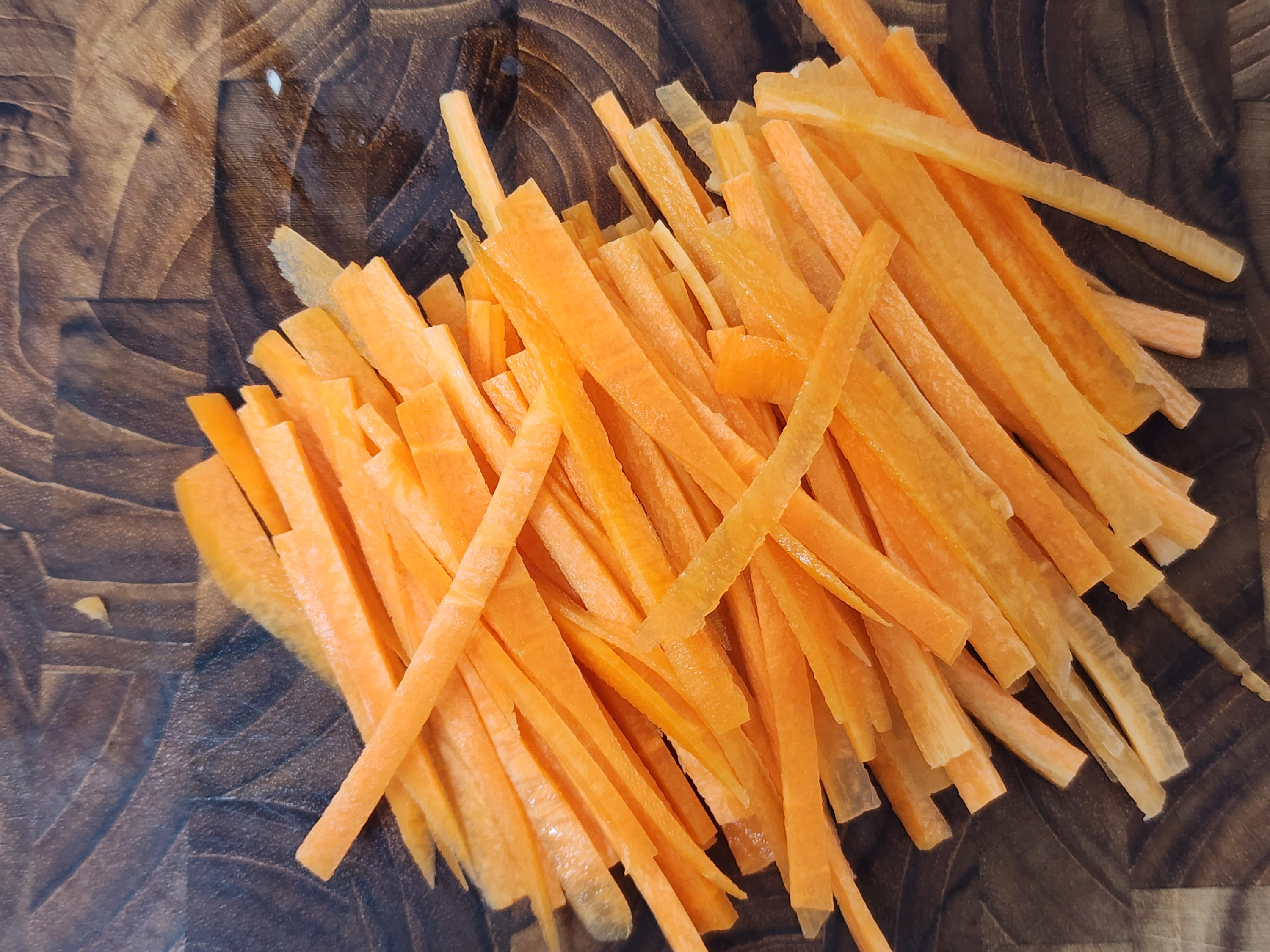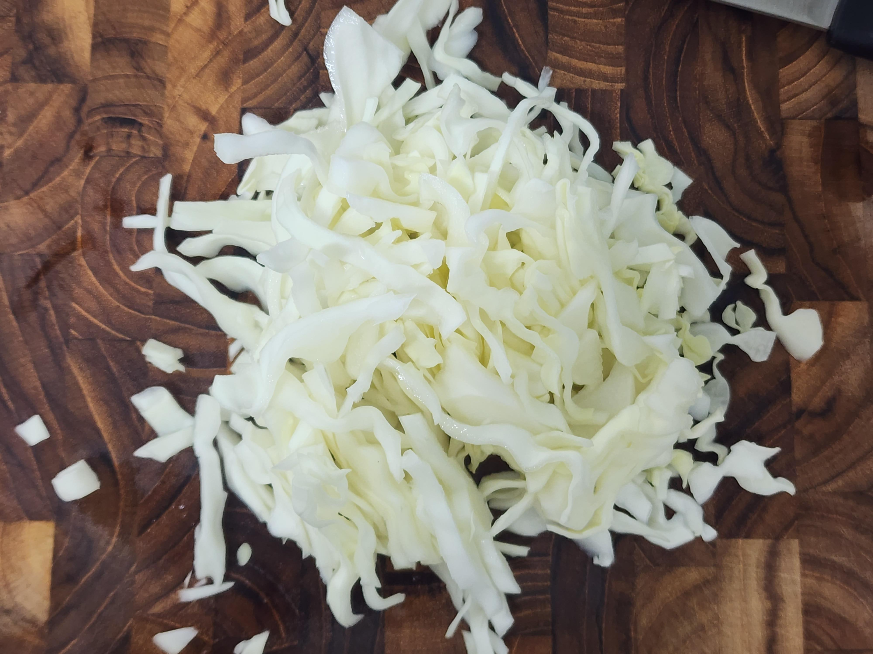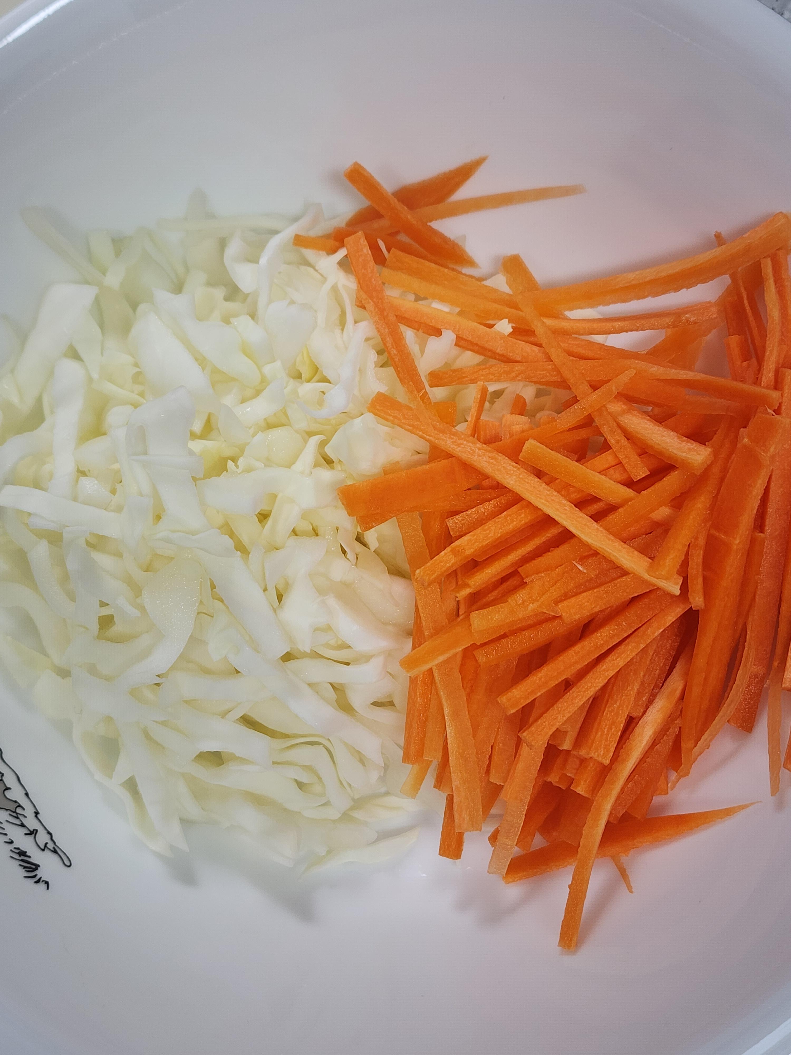 1. 양배추와 당근은 얇게 채 썰어 준비해 주세요.