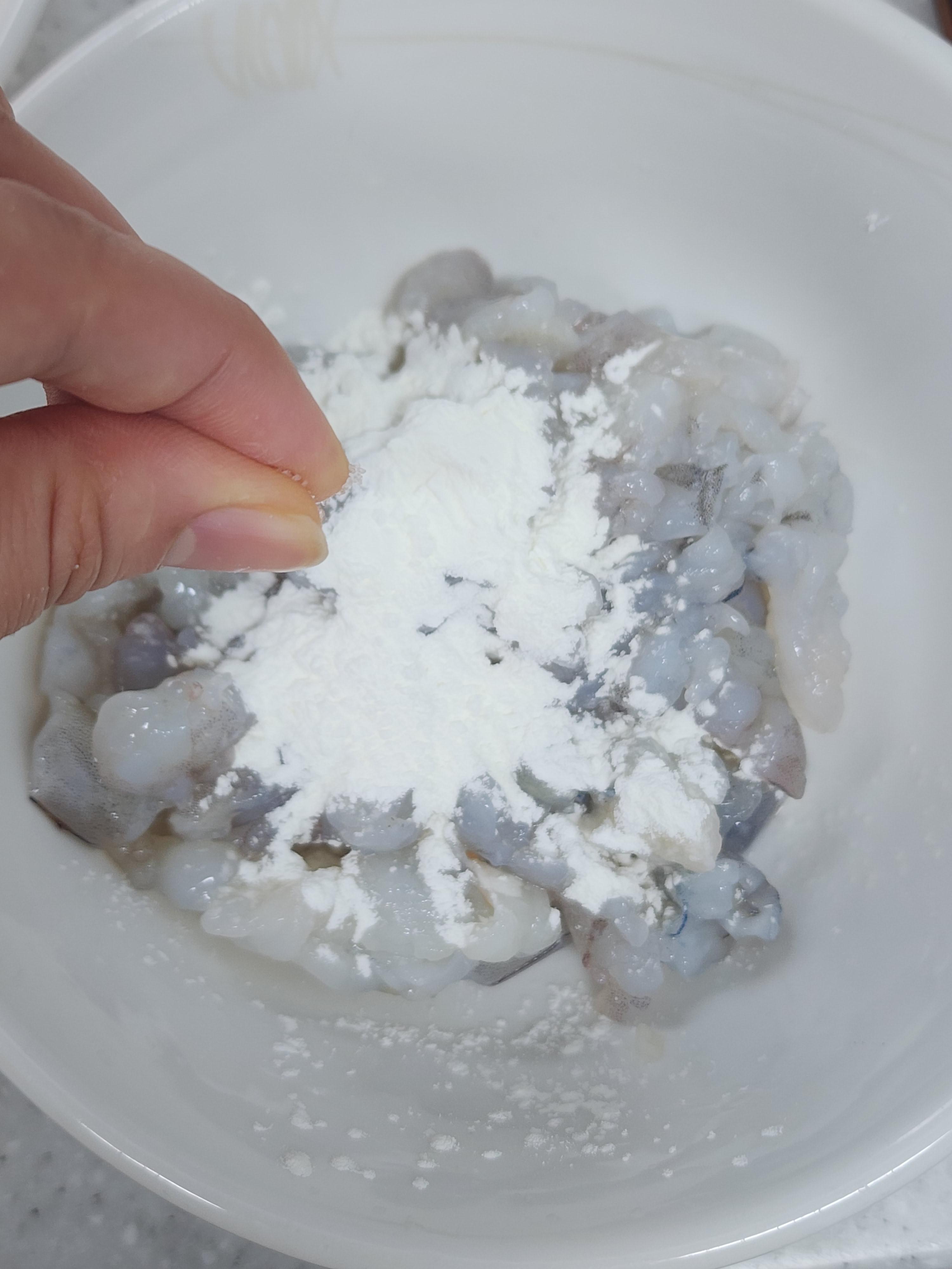 5. 다진새우를 볼에 넣고 전분가루 0.5T, 소금 2꼬집, 후추 2꼬집을 넣고 섞어 패티를 만들어주세요.