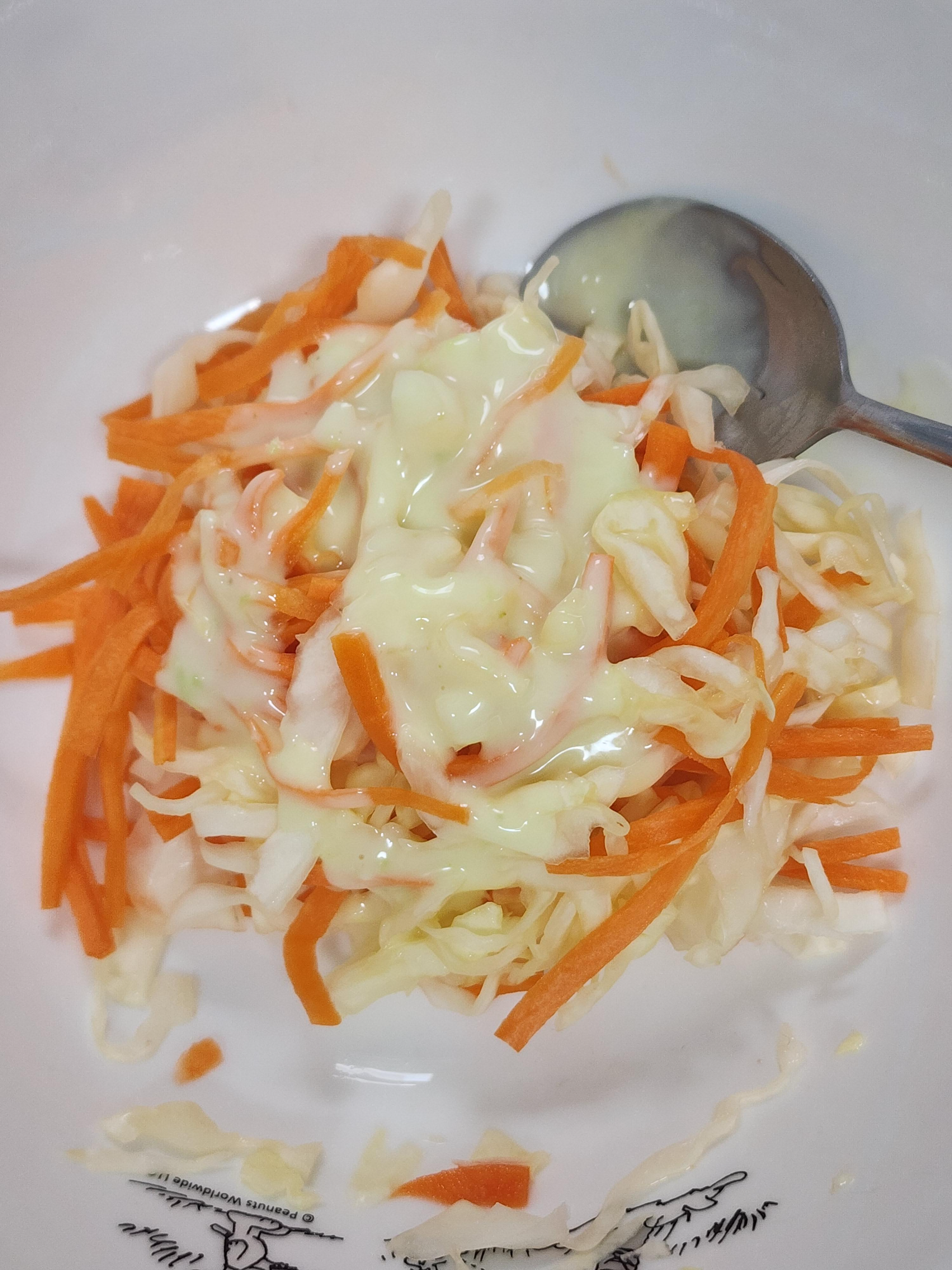 7. 절인 양배추와 당근에 만들어둔 소스를 넣고 버무려주세요.