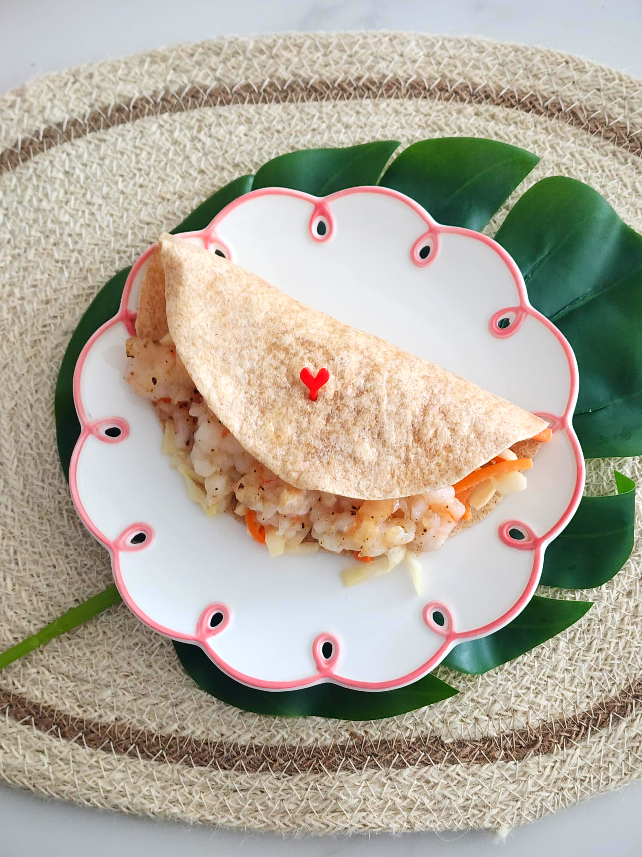 새우를 으깨 다진 후 전분가루와 소금, 후추를 넣고 구워 패티를 만들고 양배추와 당근을 채 썰어 소금에 절여 물기를 짜주고 고추냉이소스를 만들어서 야채와 버무려 토르티야에 새우패티와 야채를 넣어주기만 하면 완성되는 레시피예요.