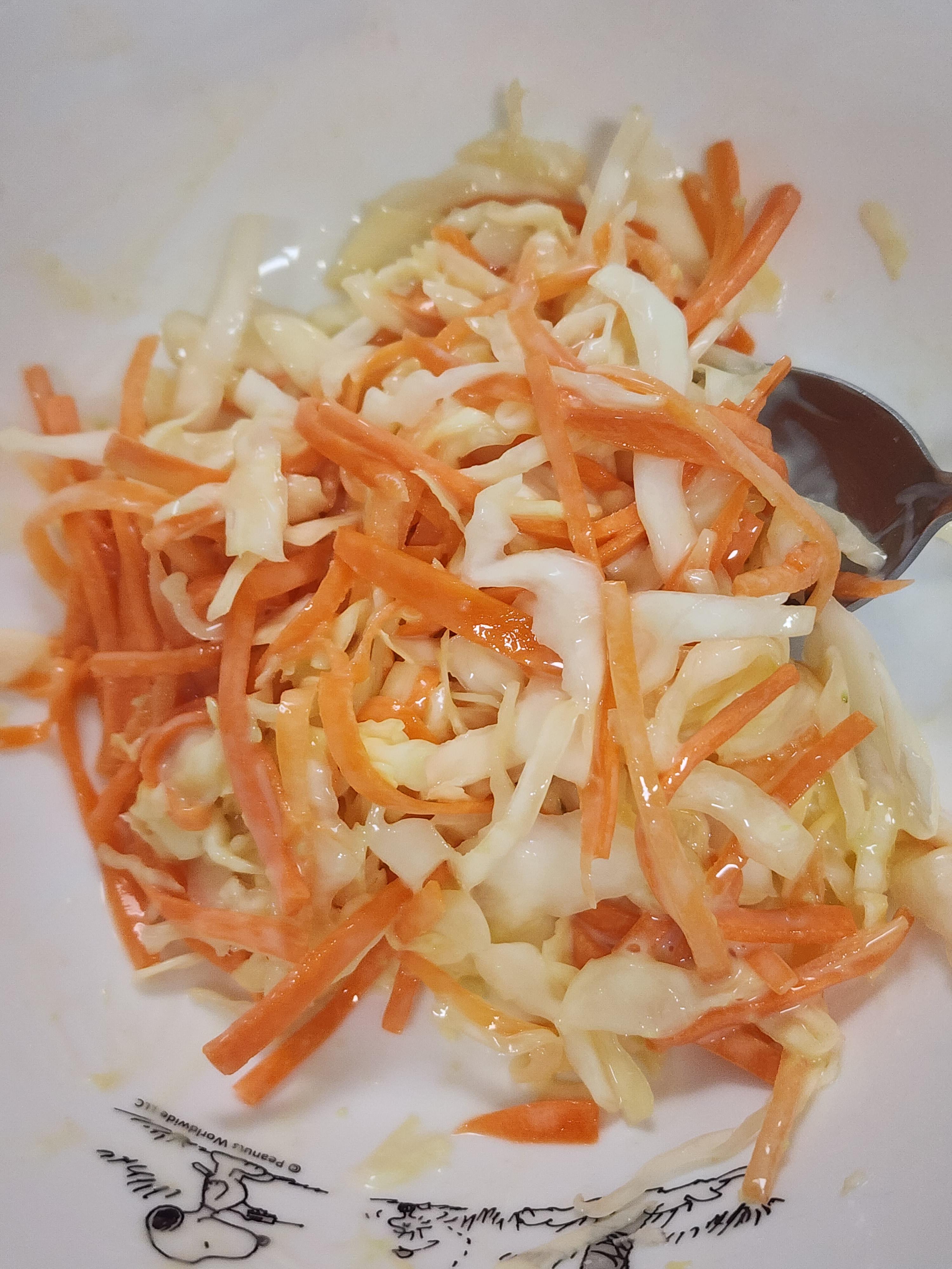2. 그릇에 양배추와 당근을 넣고 소금 2꼬집을 넣어 숨이 죽을 때까지 절인뒤 물기를 짜주세요.