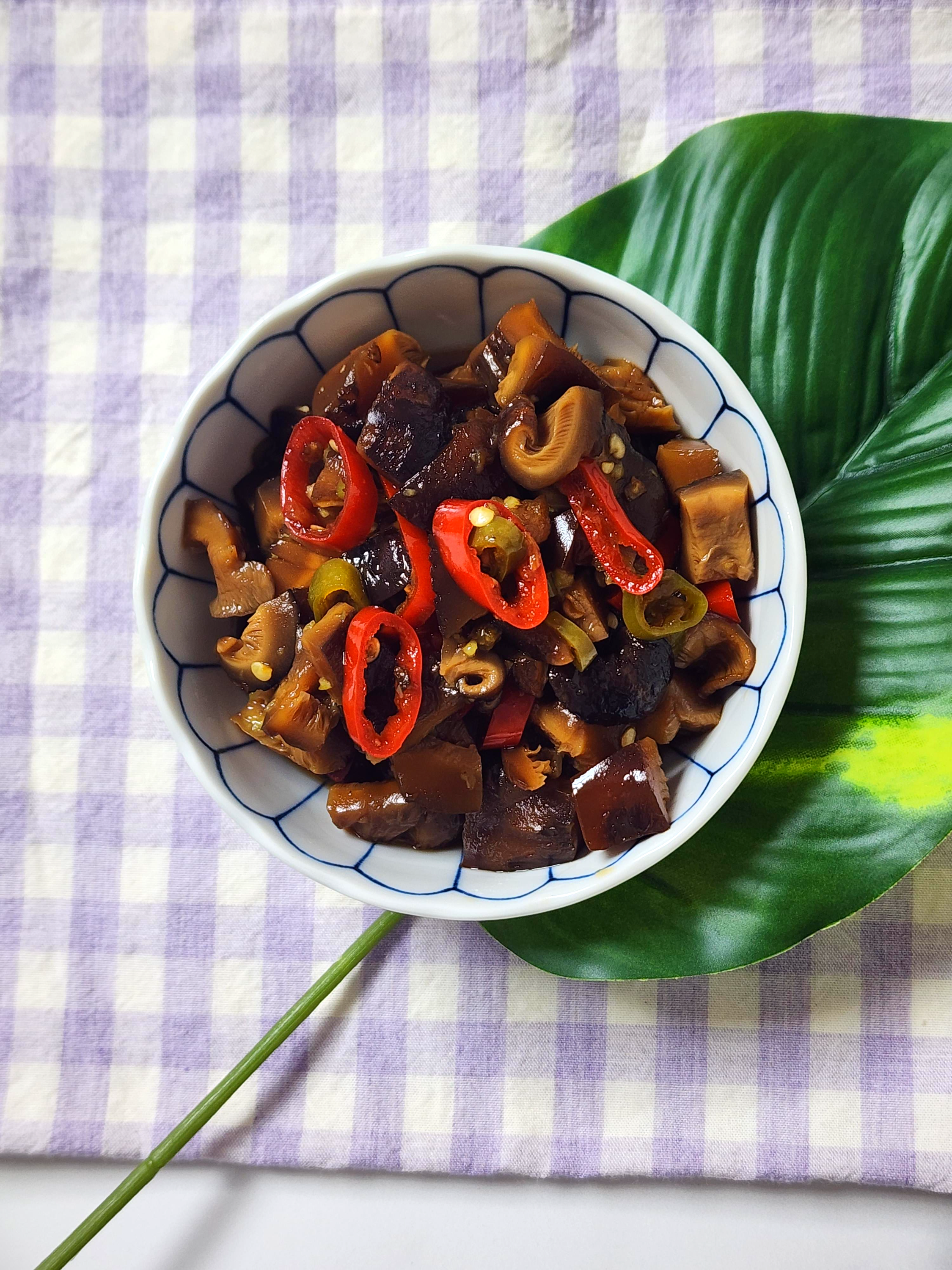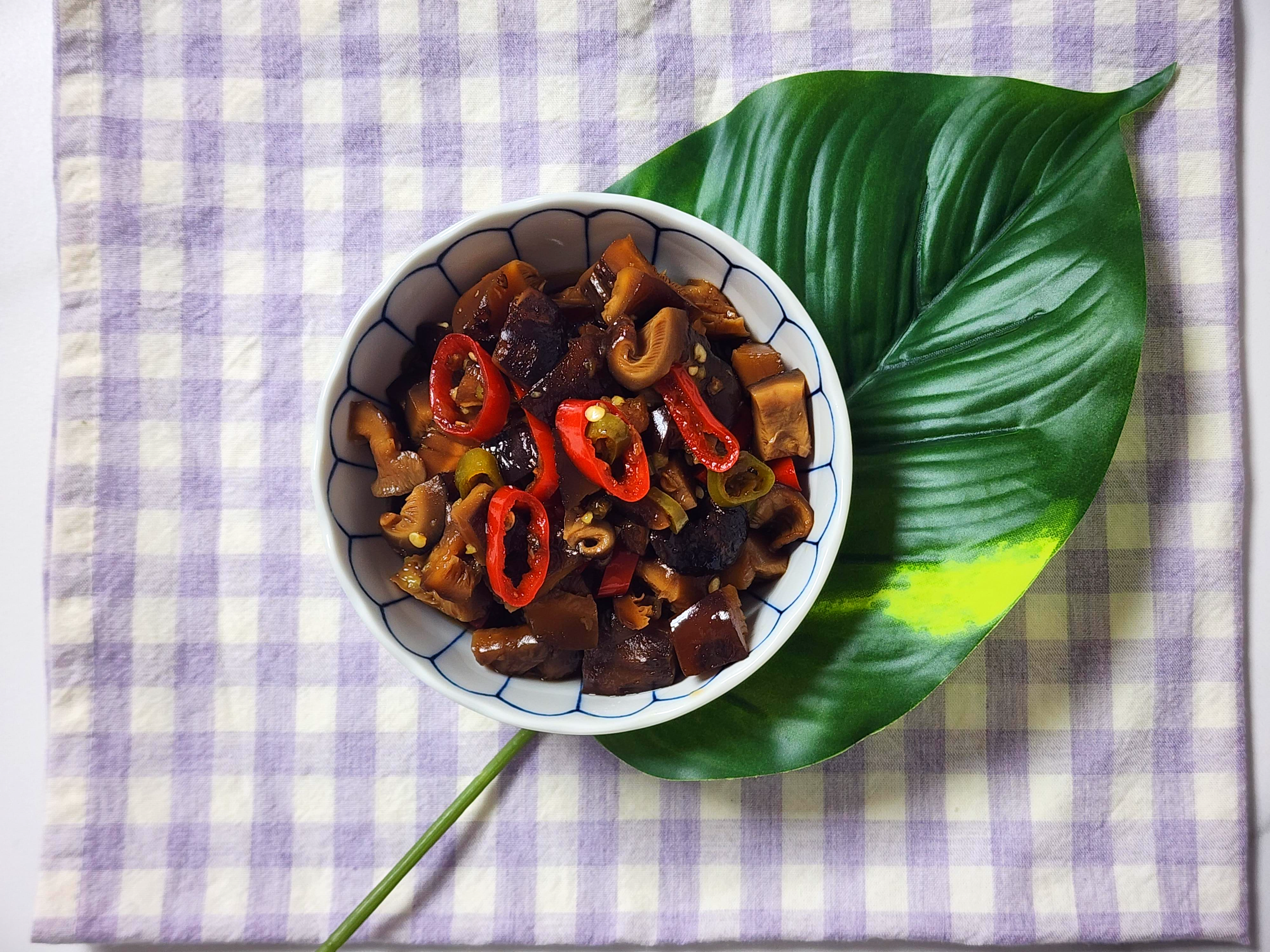 건표고버섯을 물에 불려서 다져서 간장, 식초, 올리고당과 청양고추, 홍고추와 함께 끓여주고 고추냉이를 넣어주면 완성되는 조린 장인 데요.