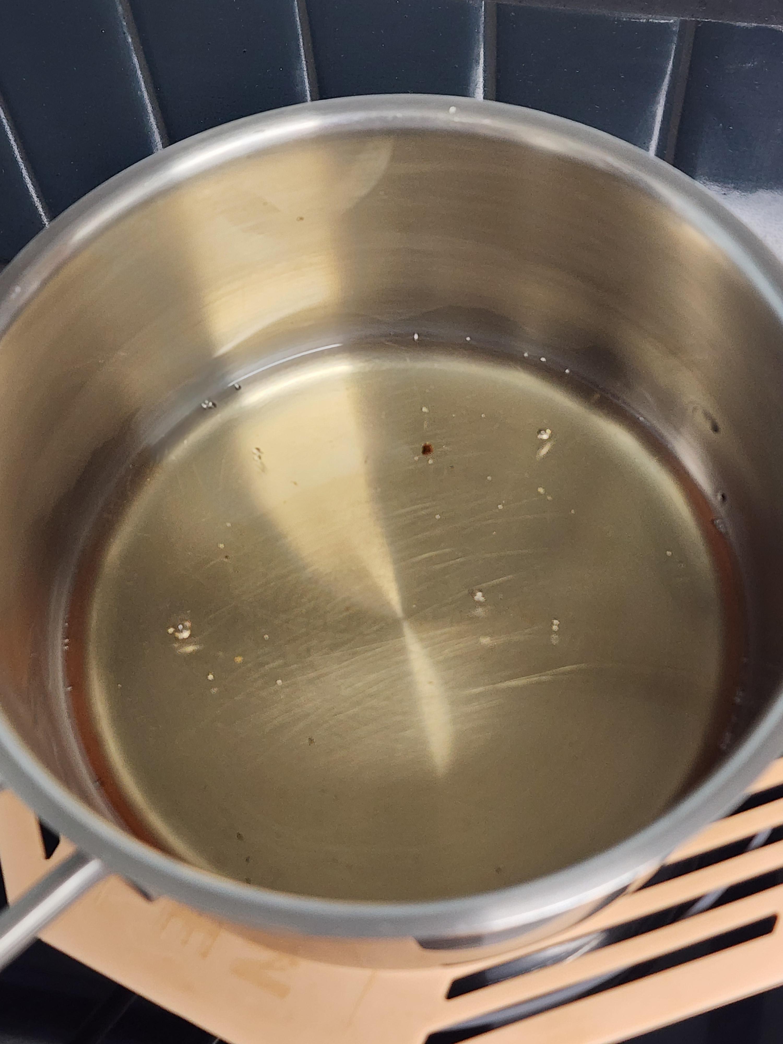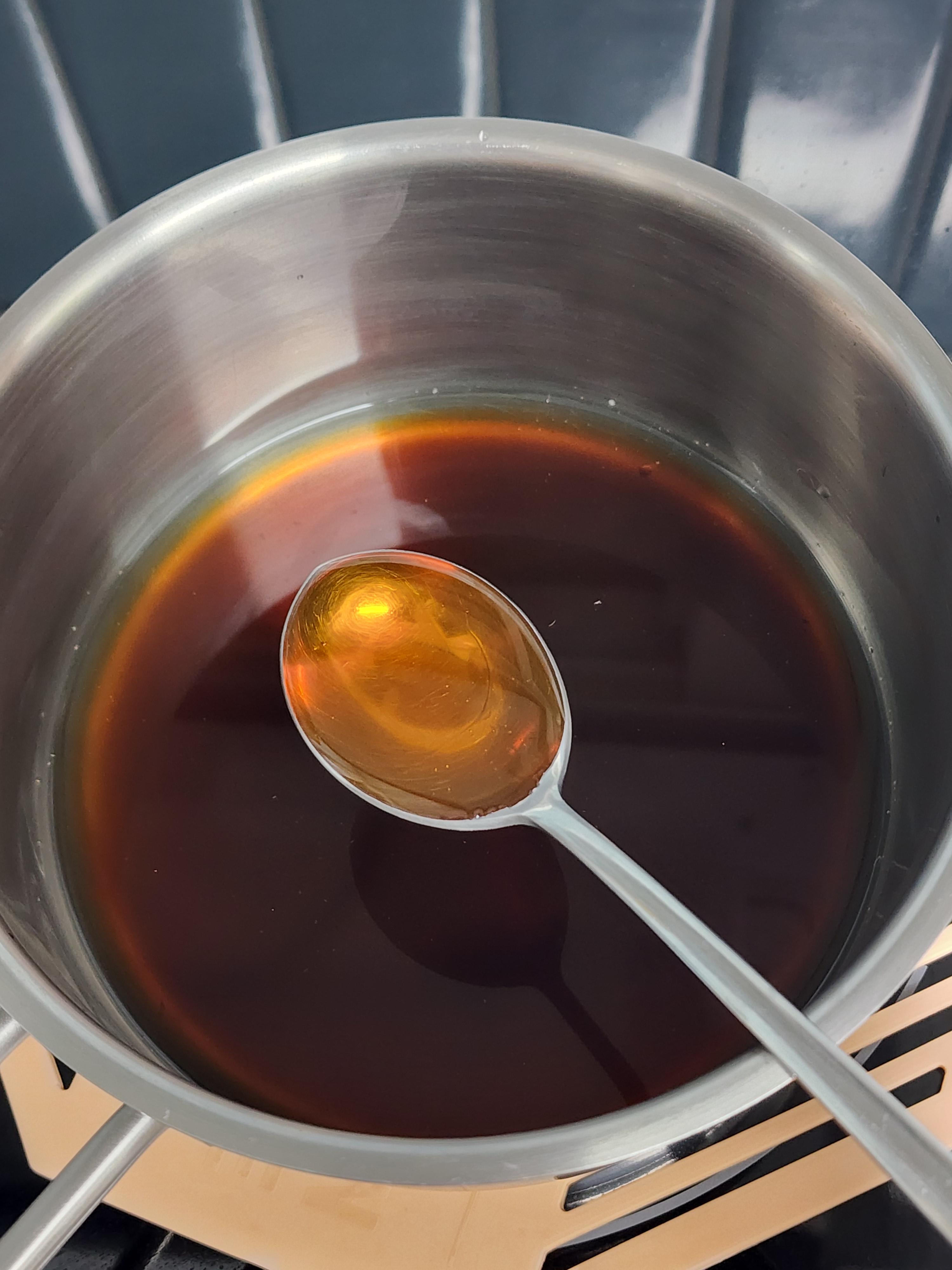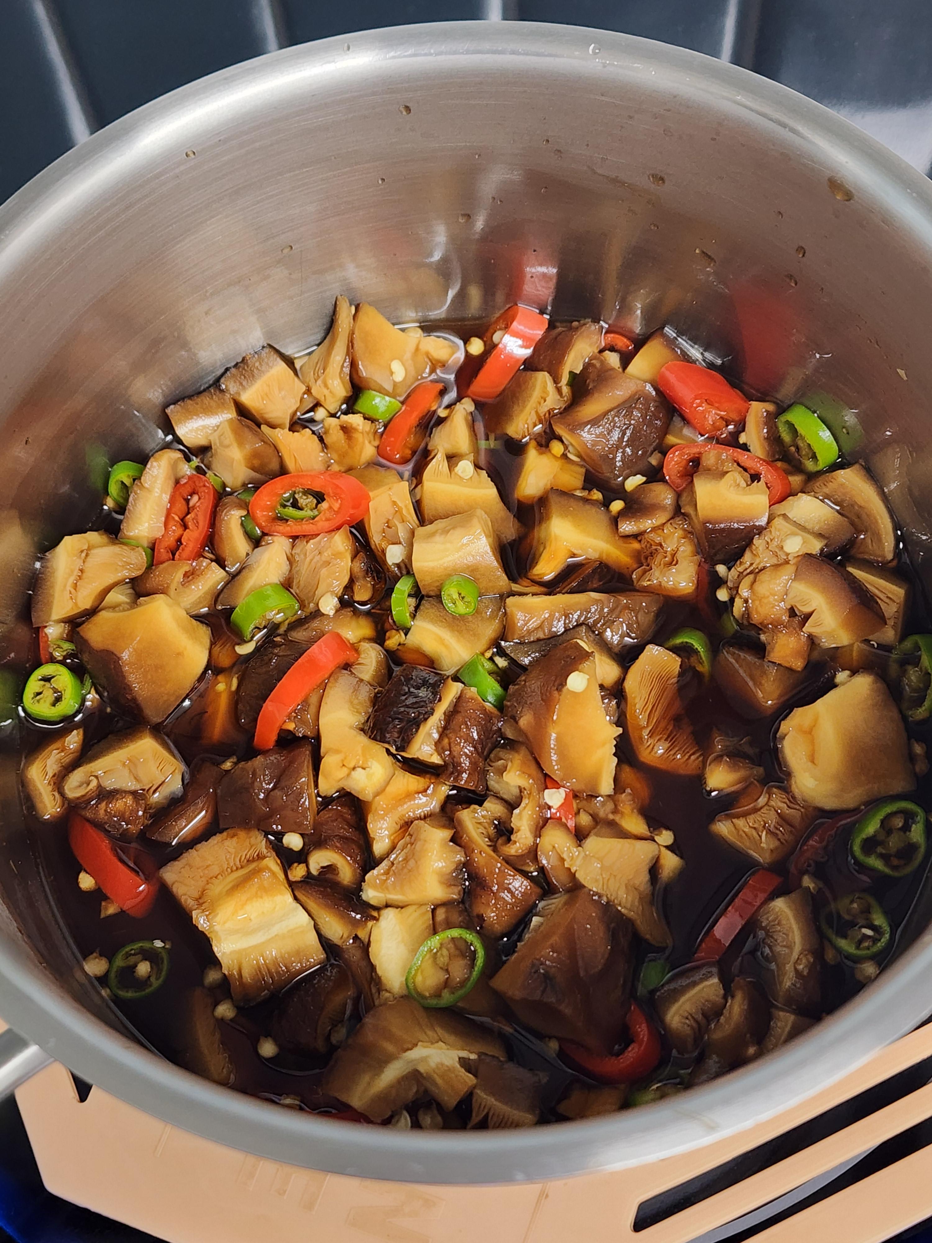 3. 팬에 표고버섯 우린 물 100g, 양조간장 3T, 사과식초 2T, 프락토올리고당 2T, 다진표고버섯, 청양고추, 홍고추를 넣고 중 약불로 3분간 졸여주세요.