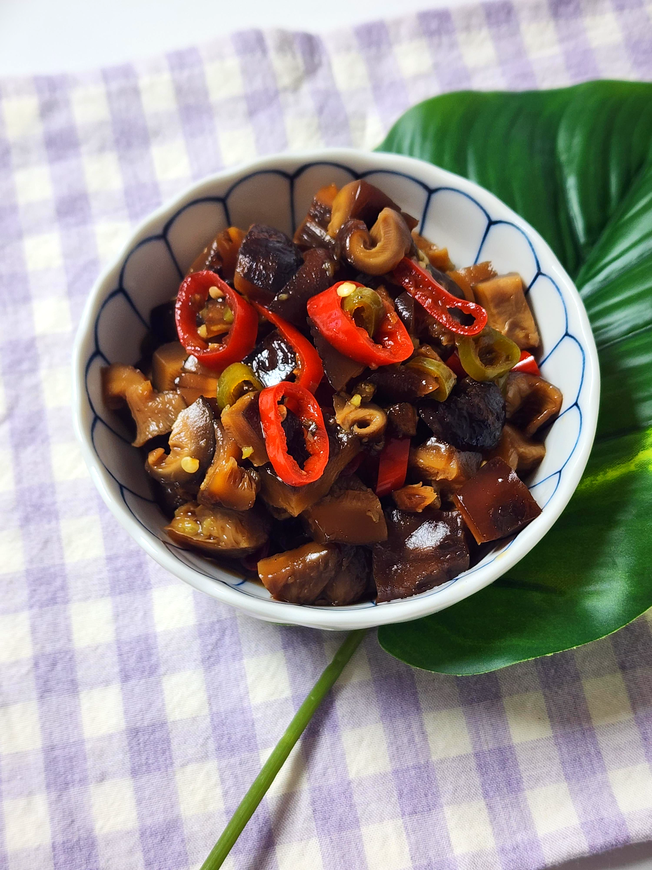필요한 재료 : 건표고버섯 4개, 고추냉이 1T, 청양고추 1개, 홍고추 1개, 물, 양조간장 3T, 사과식초 2T, 프락토올리고당 2T(올리고당으로 대체가능)