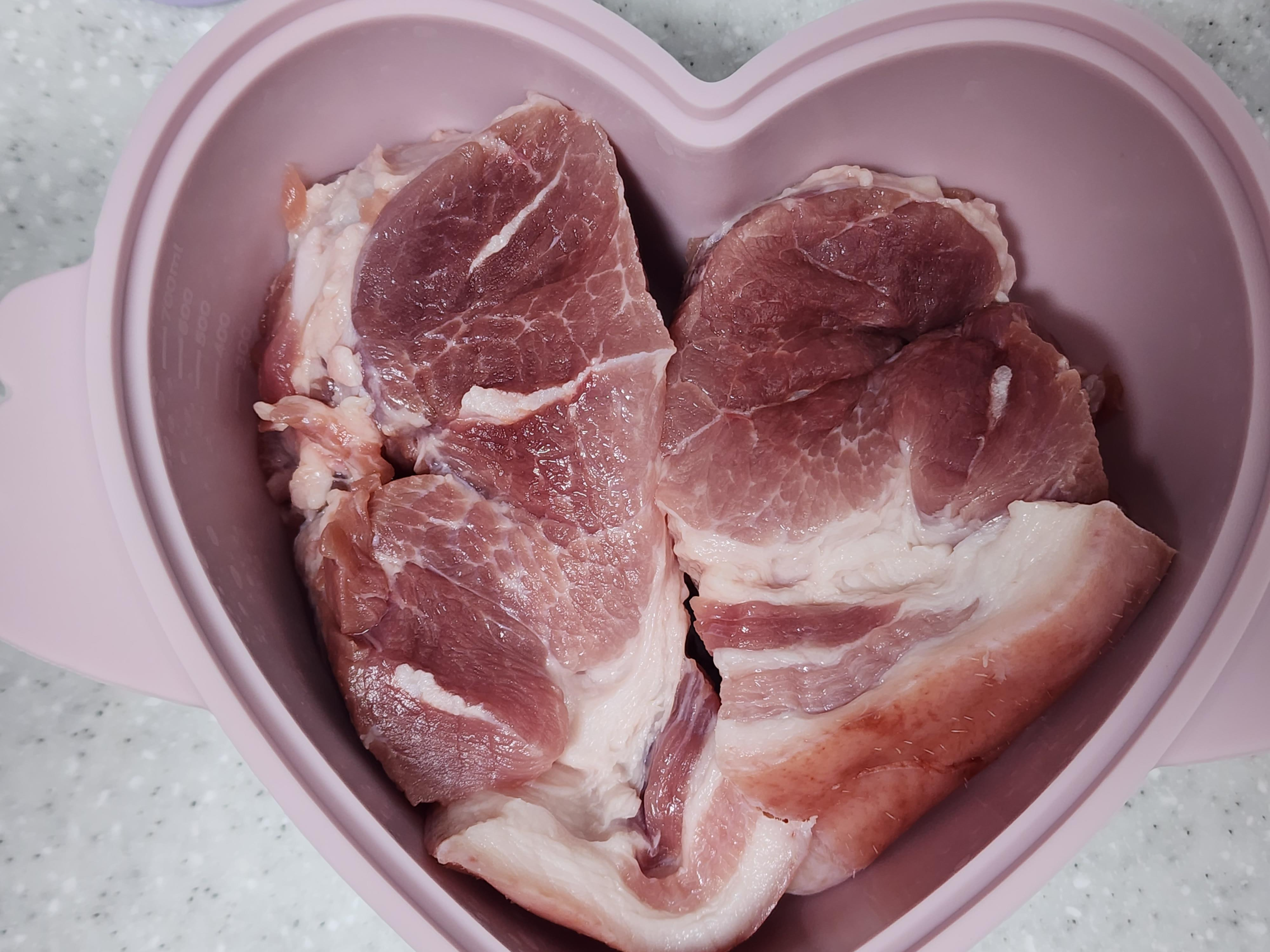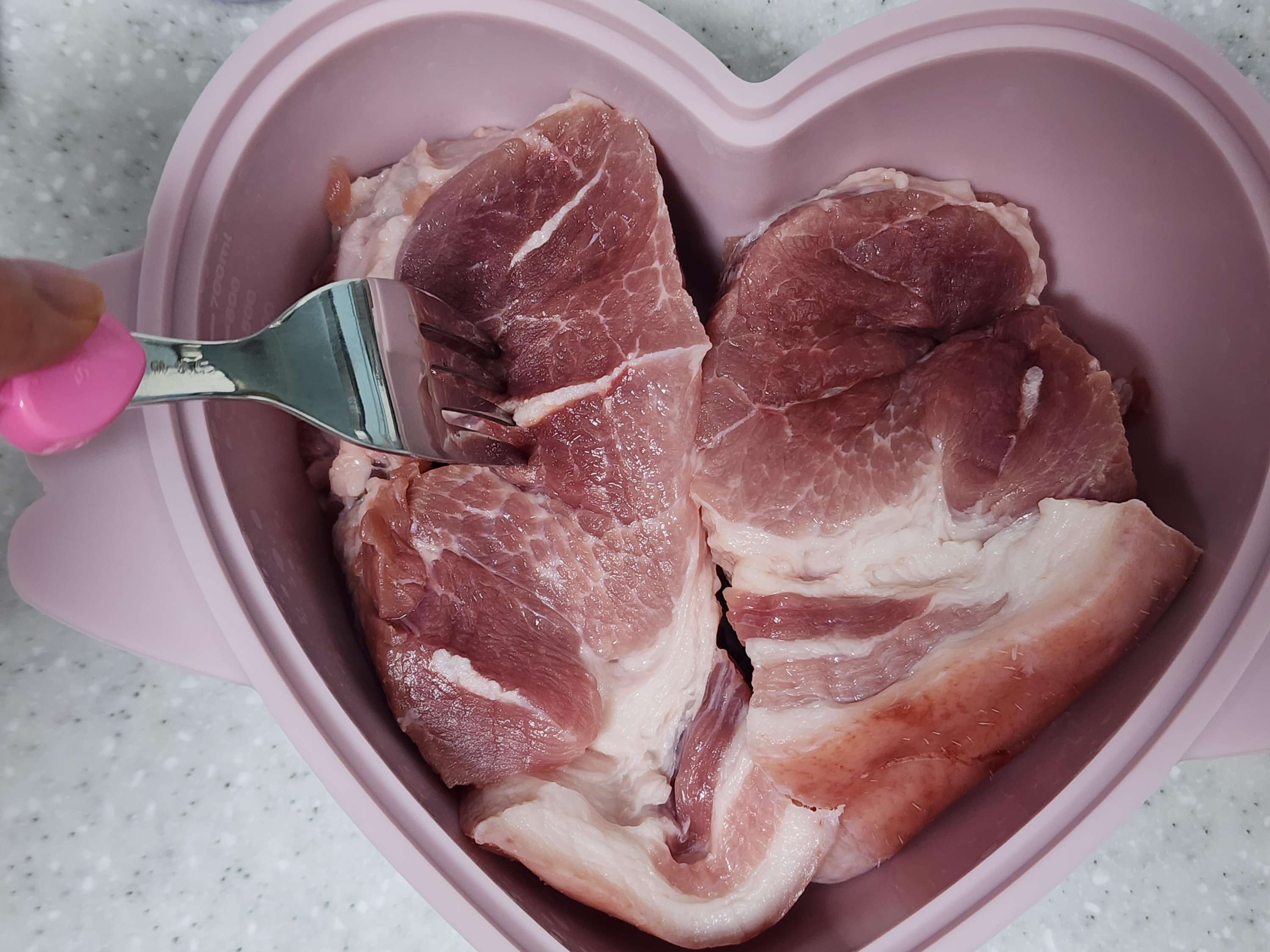 1. 앞다리살을 내열용기에 넣고 포크로 찔러주세요.
