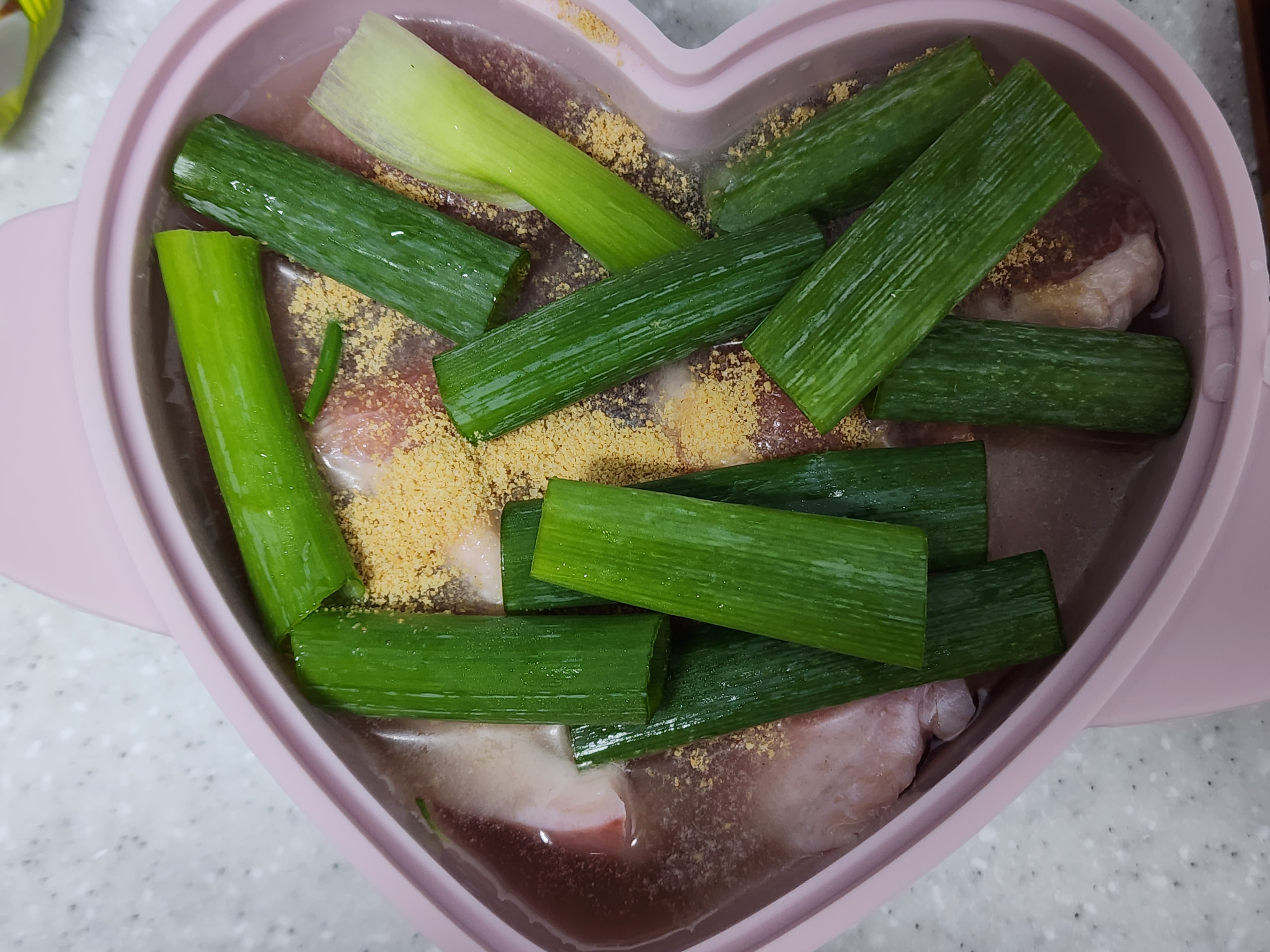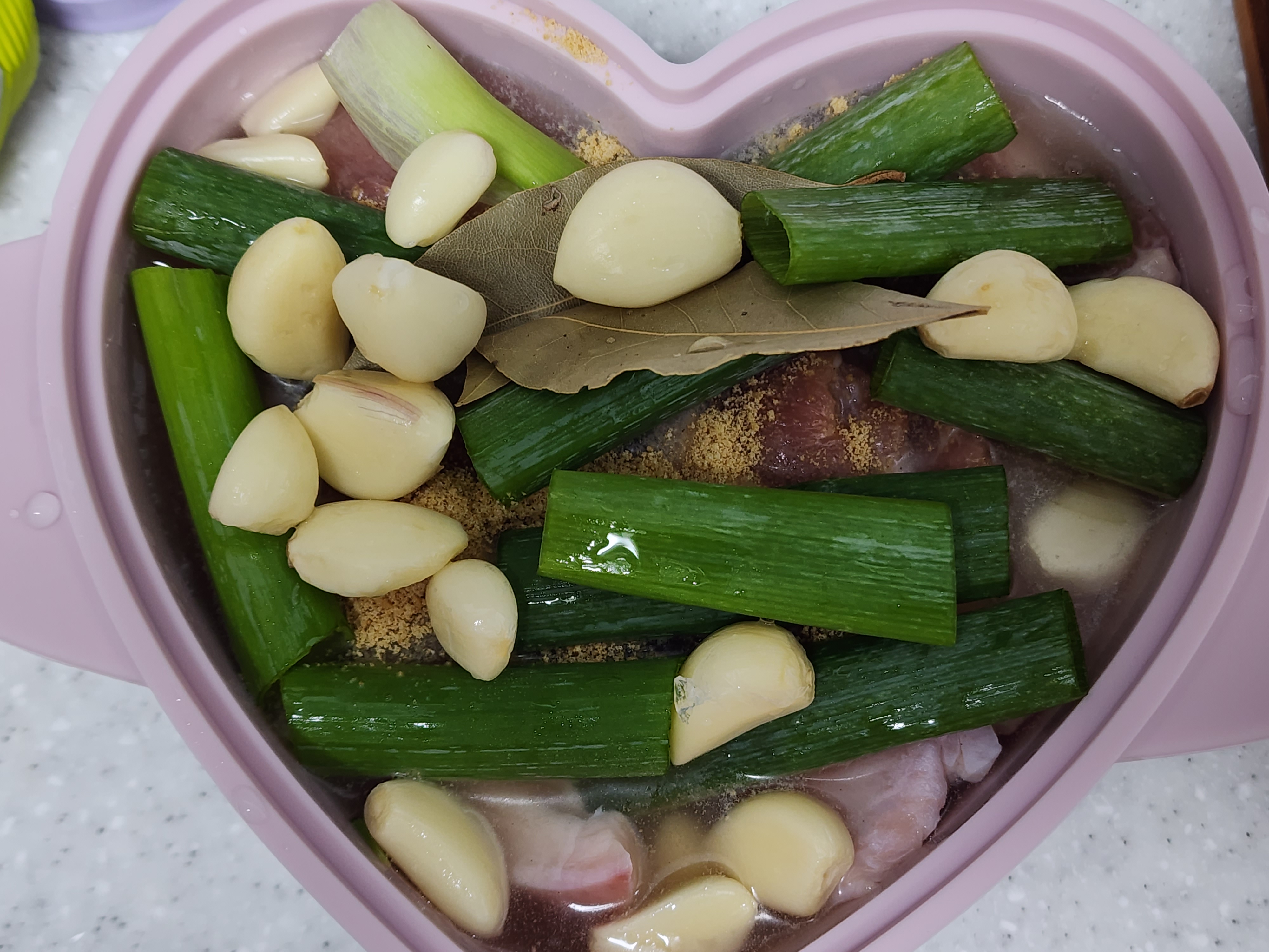 필요한 재료 : 돼지고기 앞다리살 300g, 통마늘 한 줌, 월계수잎 1장, 대파 1대, 소고기다시다 1/2t, 물 150ml