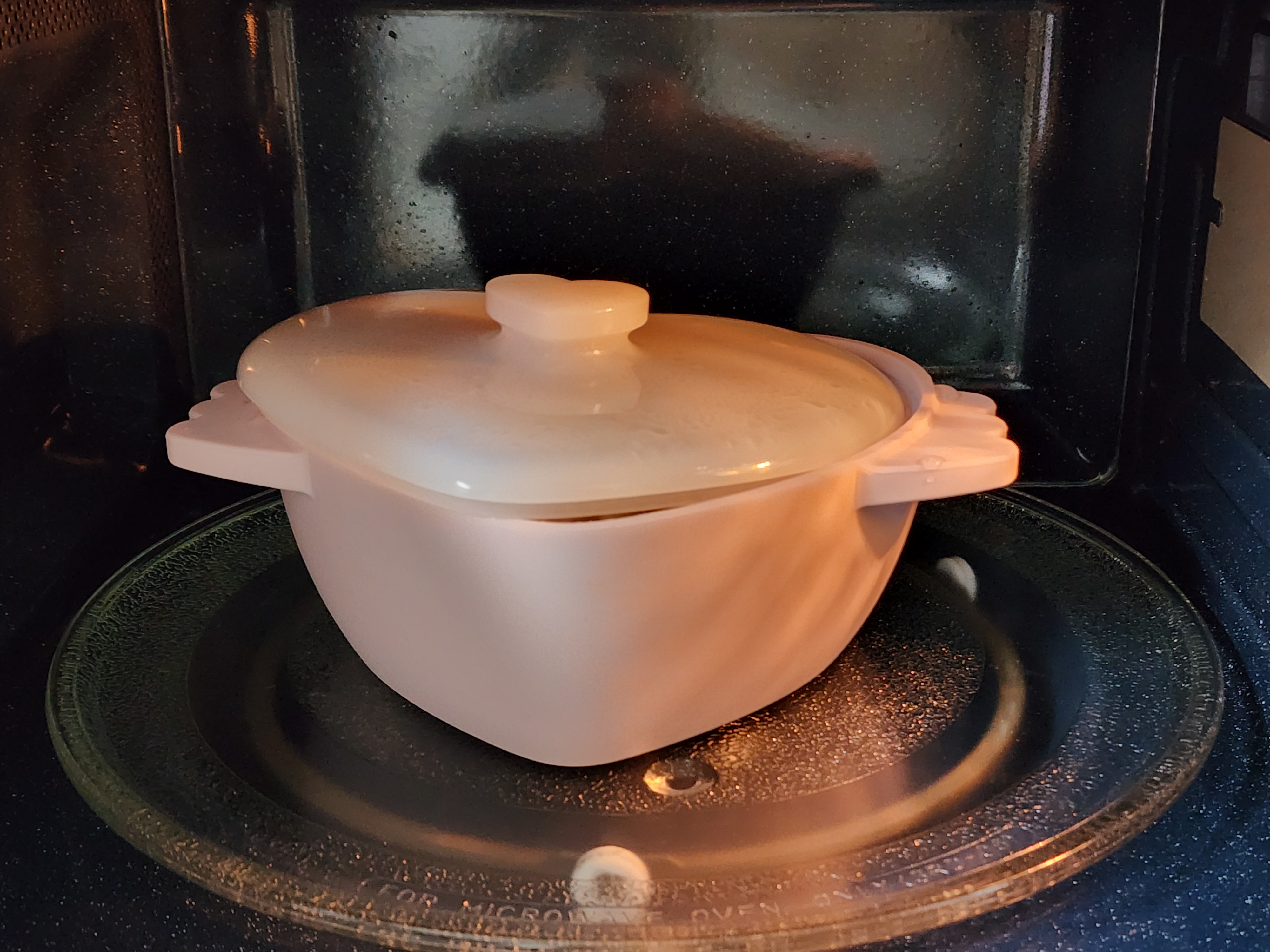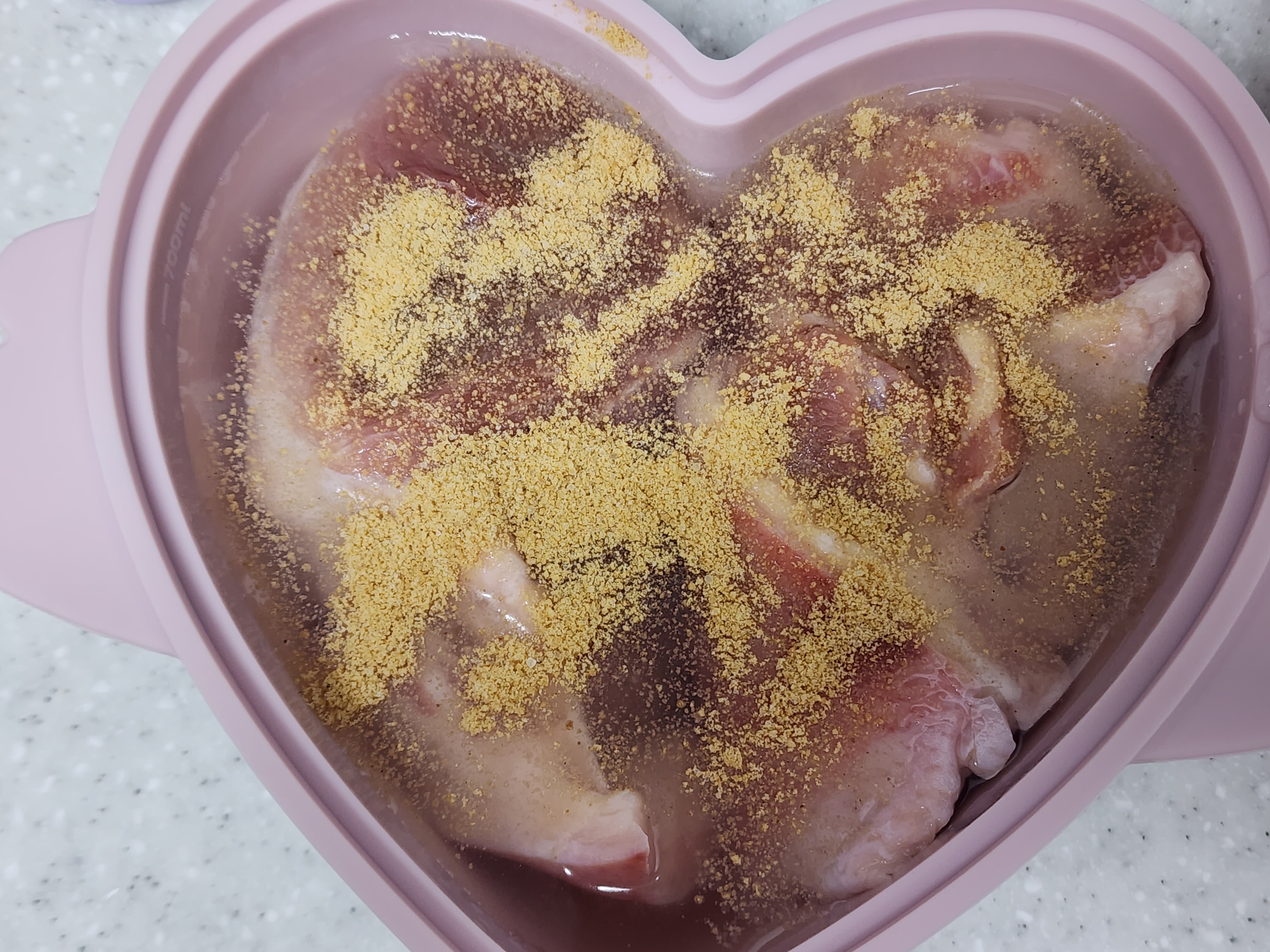 3. 앞다리살을 뒤집고 뚜껑을 살짝 덮어 전자레인지에 4분 더 돌려주세요.