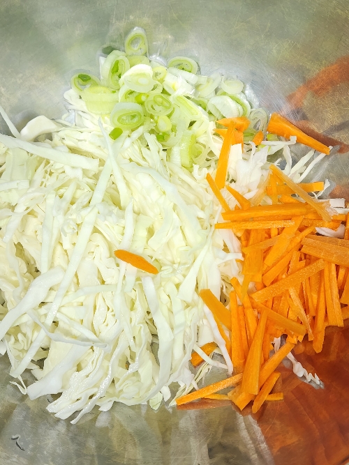 1. 양배추와 당근은 얇게 채 썰어주고 대파는 잘게 썰어주세요.