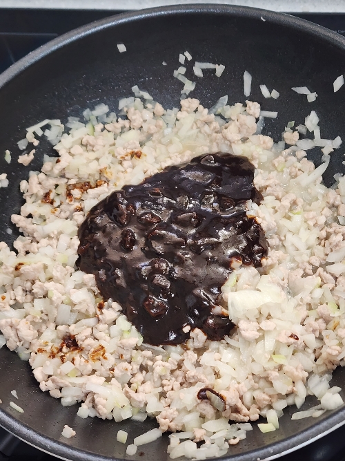 6. 양파가 익으면 짜장소스를 넣고 섞어주고 굴소스 1스푼을 넣고 볶아주세요.