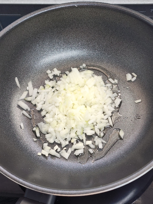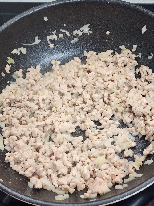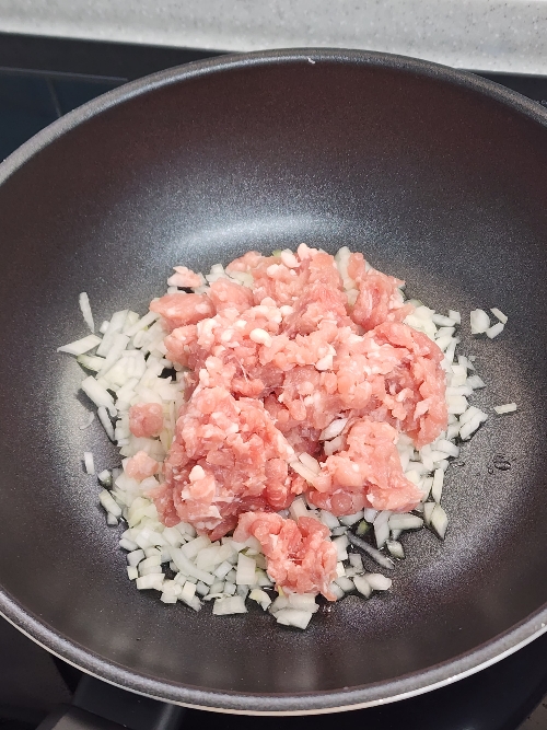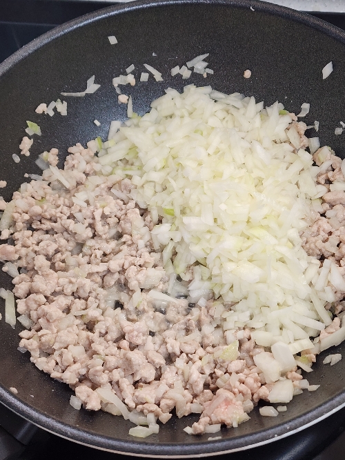 3. 팬에 식용유 3스푼을 두르고 썰어둔 양파를 조금만 넣고 그 위에 다진 돼지고기를 올려 주고 팬이 가열되면 고기와 양파를 섞어가며 볶아주세요.