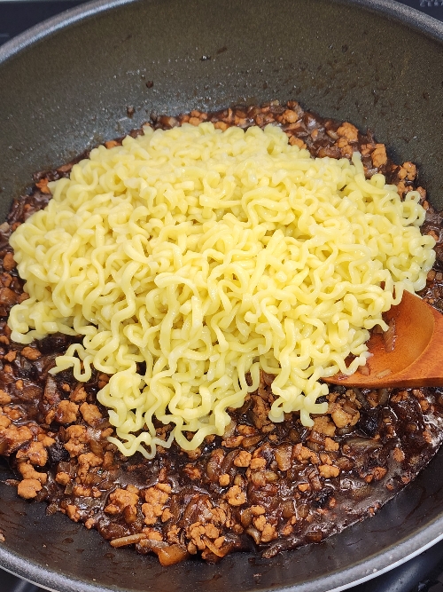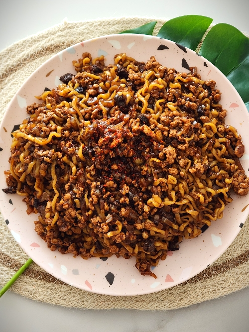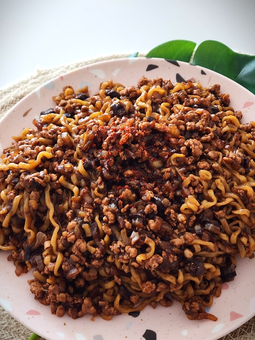 7. 면이 익으면 짜장소스에 넣고 섞어주고 기호에 따라 고춧가루를 뿌려 접시에 담아내면 완성입니다.