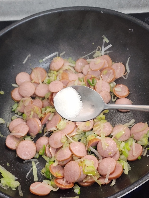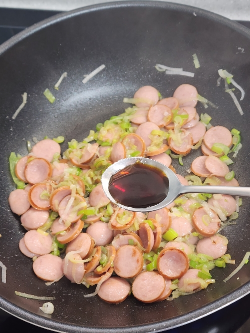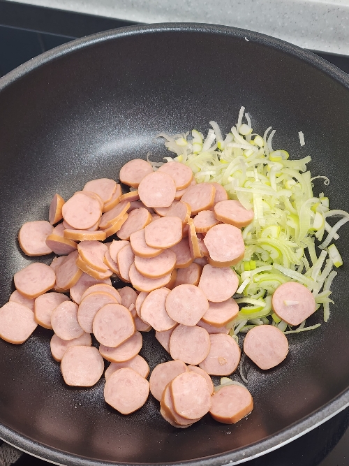 3. 팬에 식용유를 두르고 준비해 둔 대파, 소시지를 넣고 노릇하게 볶아주세요.