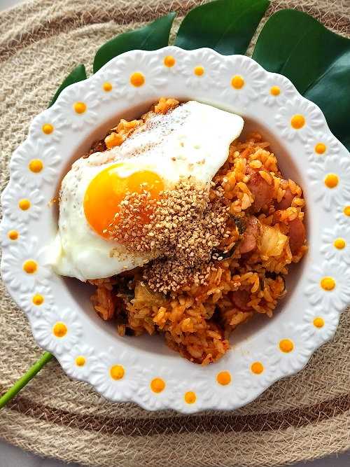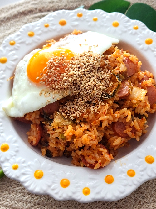 필요한 재료 : 김치 1컵(160g), 소시지 2개(65g), 대파 1/2컵(40g), 식용유 3큰술(20g), 진간장 1/2큰술(5g), 고운 고춧가루 1/3큰술(3g), 설탕 1/3큰술(3g), 즉석밥 1개, 달걀 1개, 김가루 적당량, 깨소금 적당량