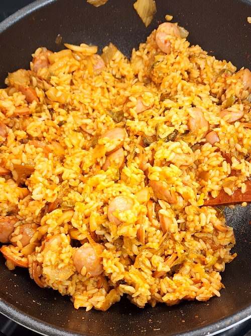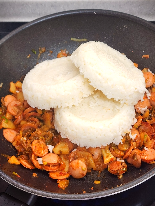7. 양념이 골고루 섞이면 불을 잠시 끄고 즉석밥을 넣고 국자를 이용해서 풀어주고 불을 다 시켜서 볶아주세요.