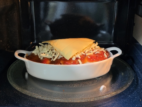 5. 토마토소스 위에 모차렐라치즈 70g을 골고루 얹고 체다치즈 1장을 덮고 랩을 씌워 전자레인지에 5분간 돌려주면 완성입니다.