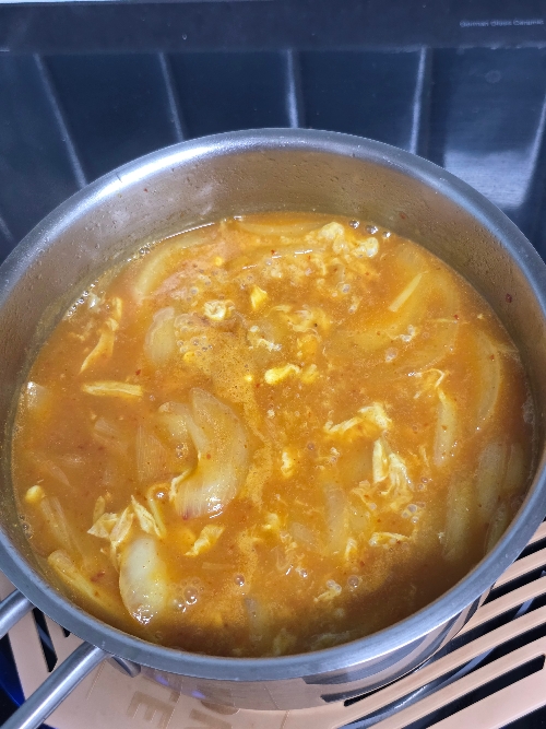5. 카레가 꾸덕해지면 볼에 계란 2개를 넣고 풀어주고 카레에 골고루 둘러주세요.