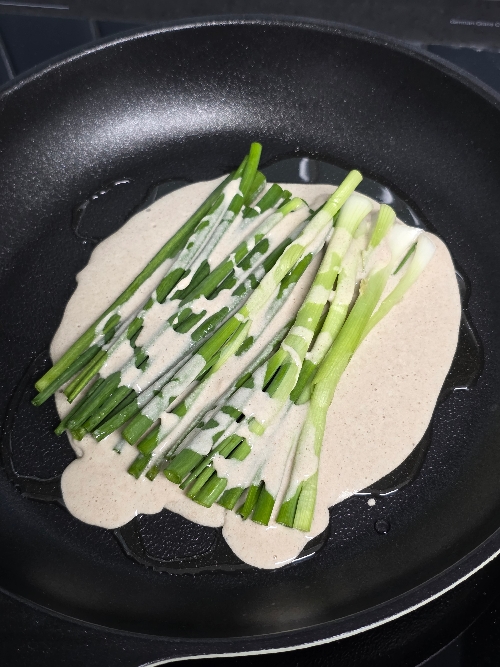 4. 달구어진 팬에 기름을 약간 두르고 메밀반죽을 부어 그 위에 쪽파를 가지런히 올려주세요.