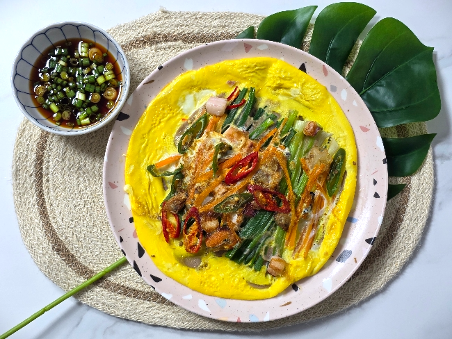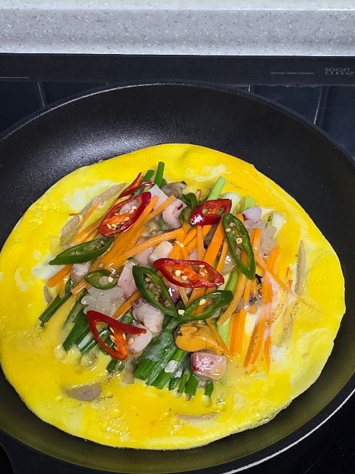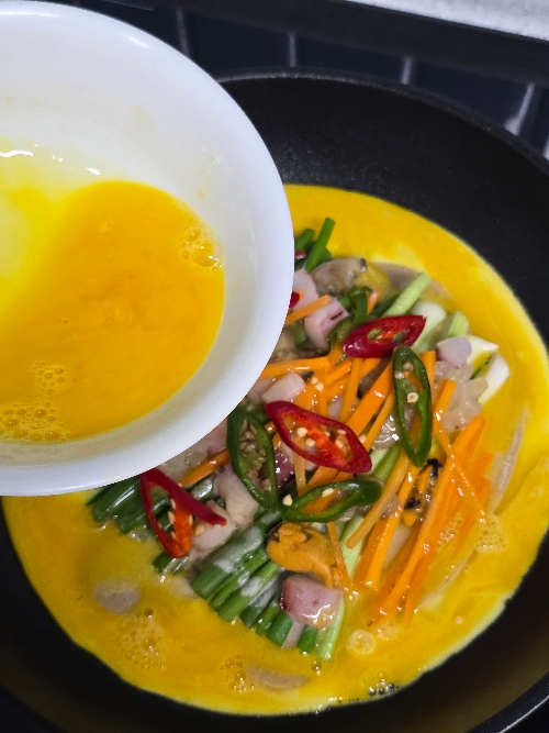 6. 그 위에 계란물을 2/3 정도 주워주고 청홍고추를 올린 다음 나머지 계란물도 부워주세요.