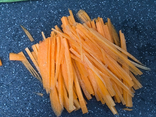 2. 당근은 채 썰어주고 청홍고추는 어슷 썰어주고 계란은 3~4개 정도 소금 약간 넣고 풀어주세요.