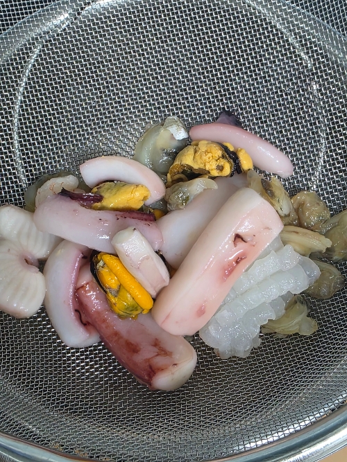 저는 집에 혼합으로 된 냉동해물이 있어서 그걸 데쳐서 사용했어요.