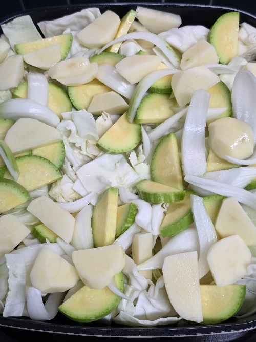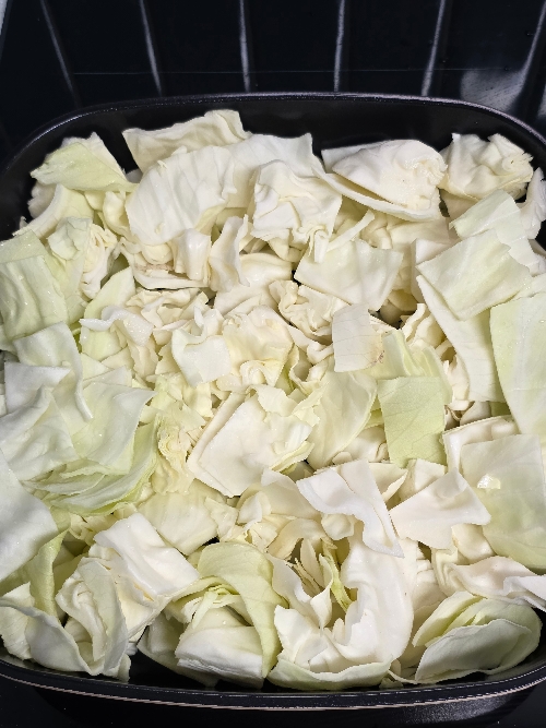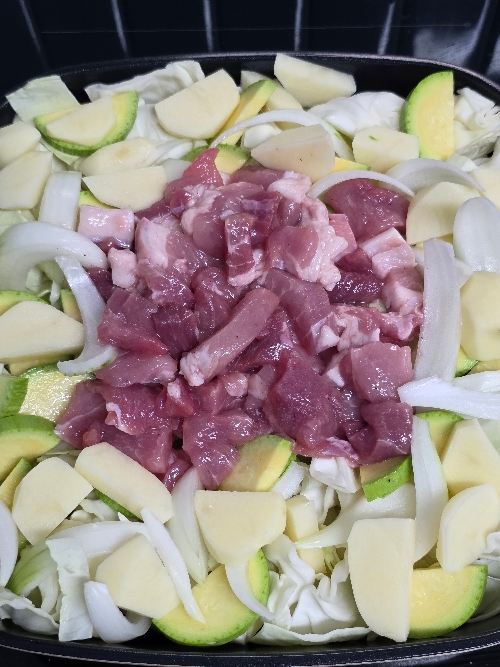 5. 냄비에 양배추를 먼저 깔고 그 위에 준비해 둔 야채와 고기를 올려주세요.
