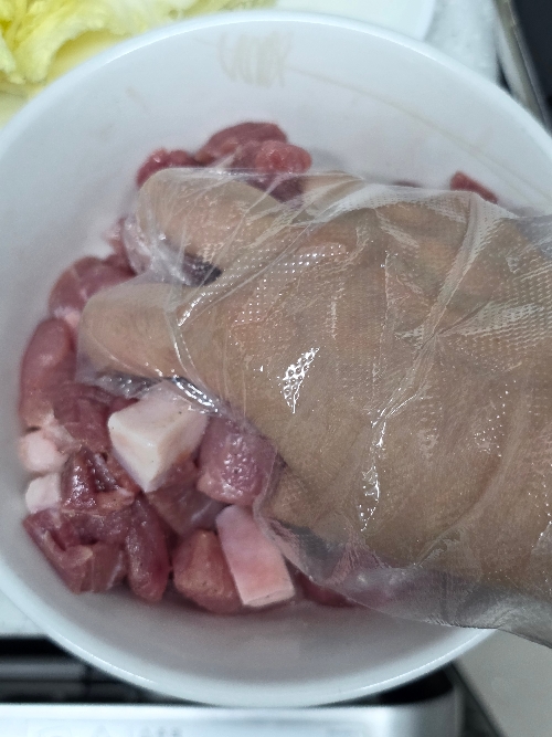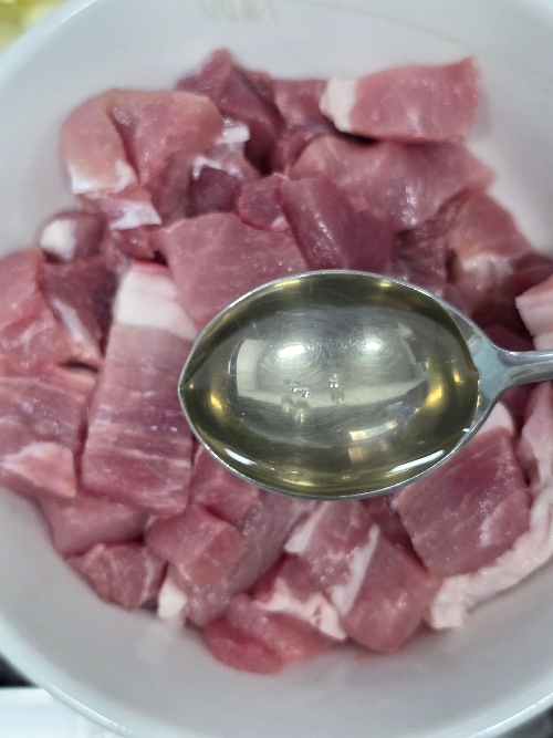 4. 돼지고기는 손가락크기로 썰고 맛술 1T, 소금 1꼬집, 후추 톡톡을 넣고 버무려주세요.