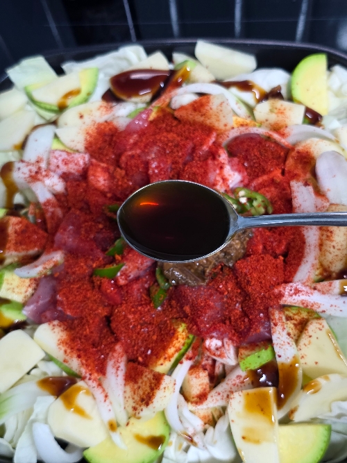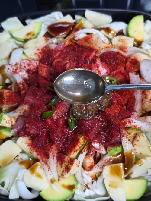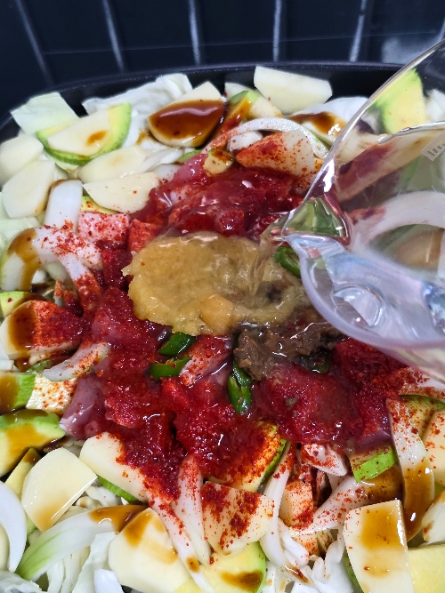 6. 고춧가루 3T, 된장 1/2T, 국간장 4T, 참치액 3T, 굴소스 1T, 맛술 2T, 다진 마늘 크게 1T, 물 500ml를 넣고 뚜껑을 닫고 중불로 25분 끓여주세요.