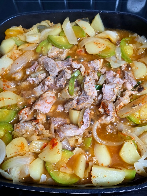 필요한 재료 : 양배추 1/2통(약 679g), 애호박 1/2개, 양파 1/2개, 대파 1/3대, 청양고추 1개, 감자 1.5개, 부추 한 줌, 돼지고기 앞다리살 200g, 소금 1꼬집, 맛술 1T, 후추 톡톡, 물 500ml, 고춧가루 3T, 된장 1/2T, 국간장 4T, 참치액 3T, 굴소스 1T, 맛술 2T, 다진 마늘 크게 1T