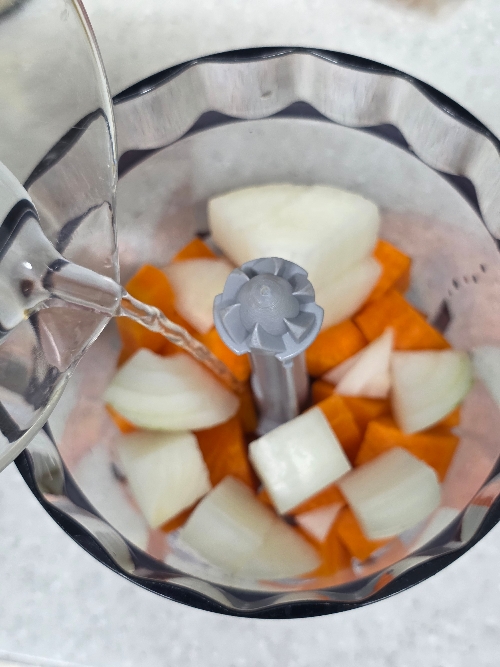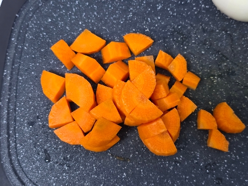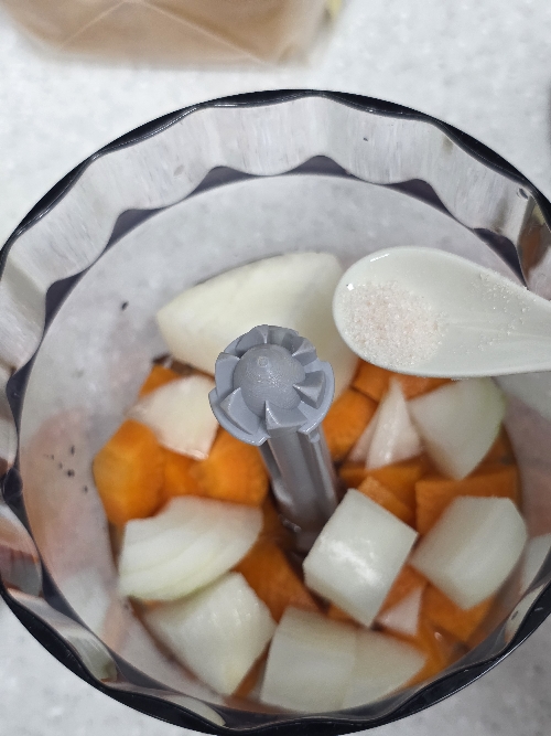 1. 당근 1개, 양파 1/2개는 믹서기에 갈기 좋도록 적당한 크기로 잘라주세요.