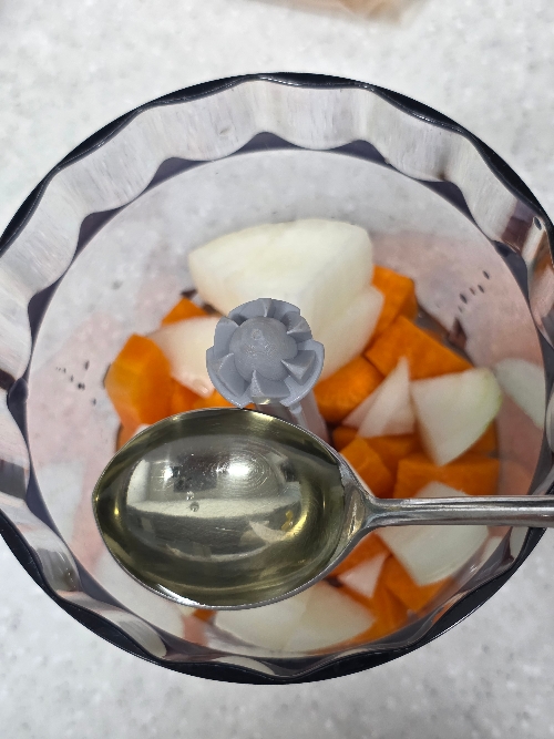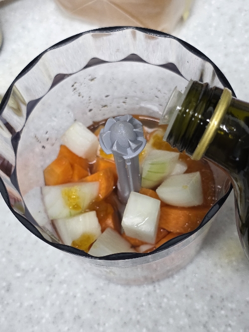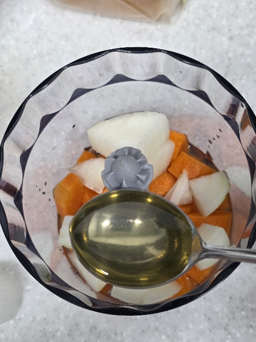 2. 믹서기에 손질한 당근, 양파, 물 1/2컵, 식초 4T, 설탕 1/2T, 소금 한 꼬집, 꿀 1T, 올리브유 2바퀴, 유자청 1T를 넣고 갈아주면 완성입니다.