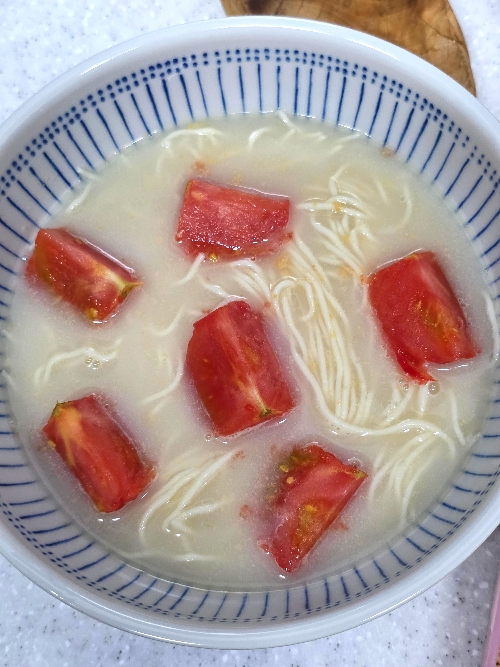 3. 물기를 뺀 두유면을 육수에 넣고 얼린 토마토를 먹기 좋은 크기로 잘라 얼음 대신 띄워 차갑게 만들어주세요.