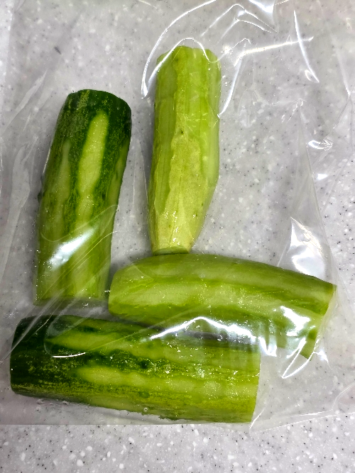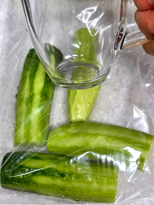 2. 반으로 자른 오이를 지퍼백에 넣고 컵의 바닥 부분으로 오이를 두드려서 살짝 으깨주세요.