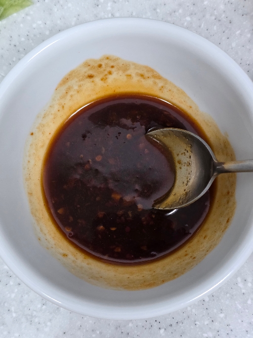 5. 볼에 설탕 2T, 식초 2T, 양조간장 1T, 두반장 듬뿍 1T를 넣어 섞어주세요.