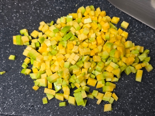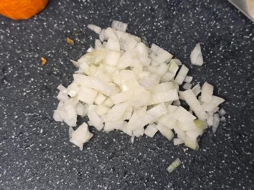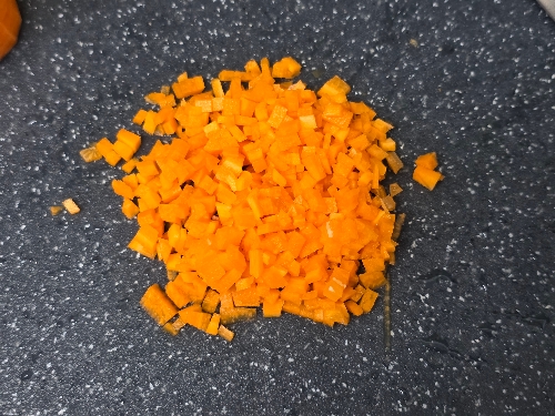 1. 당근 1/3개, 양파 1/3개, 애호박 1/3개, 새송이버섯 1개를 다져주세요.