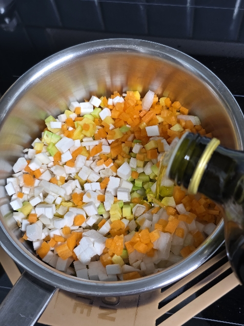2. 냄비에 다진채소들을 넣고 아보카도유를 둘러 강불에 볶아주세요.