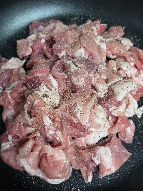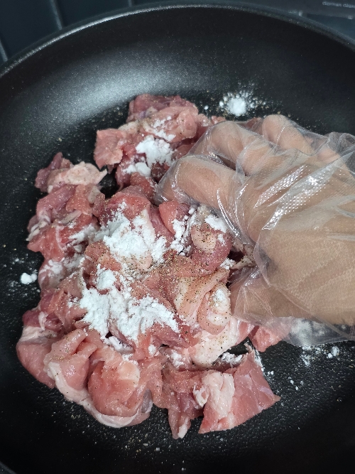 4. 불을 올리지 않은 팬에 썰어둔 앞다리살을 깔고 소금 2꼬집, 후추, 감자전분 1/2T를 넣고 버무려주세요.