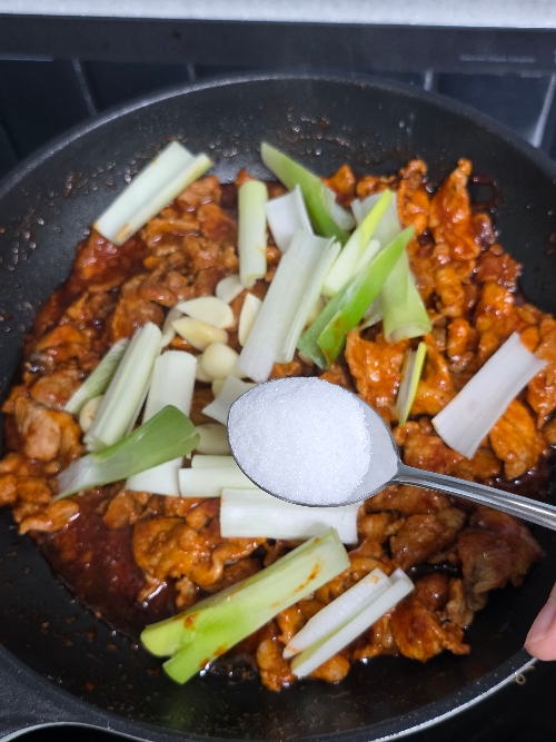 9. 고기에 고추장이 잘 입혀지면 가장자리에 간장 2T를 두르고 설탕 3T, 대파, 마늘을 넣고 볶아주세요.