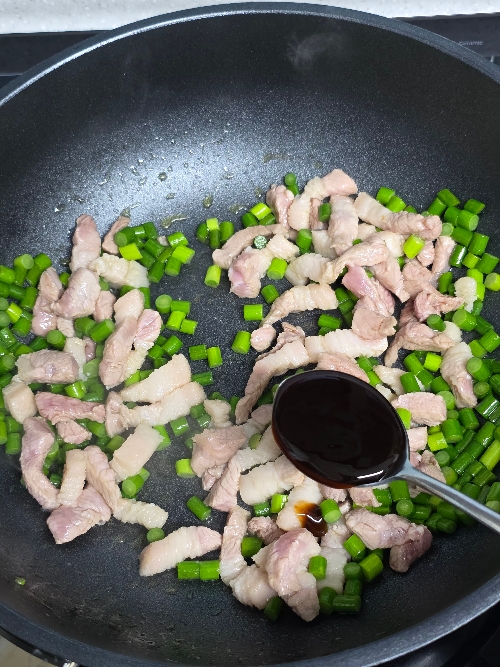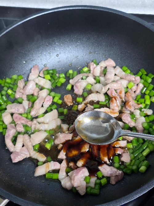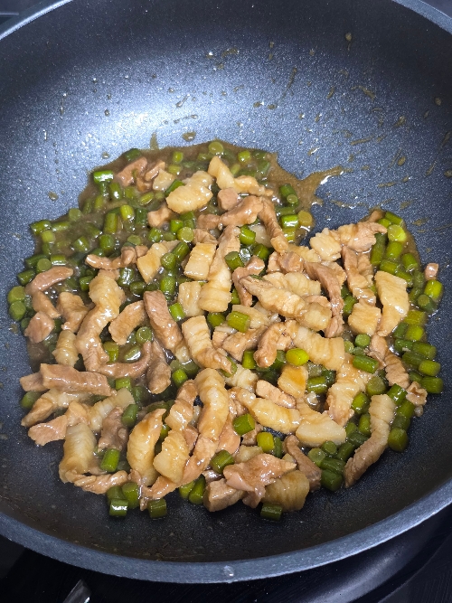 4. 마늘종 기름이 나오면 고기를 넣고 볶아주세요.
