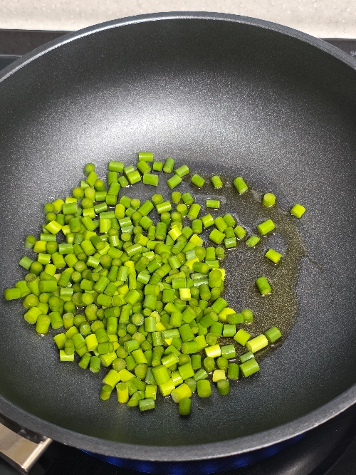 3. 웍에 식용유를 둘러 예열하고 마늘종을 넣고 볶아주세요.