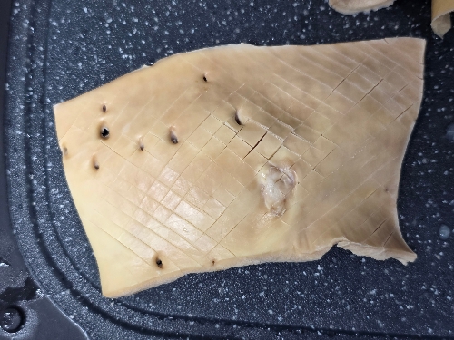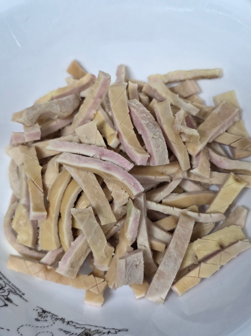 3. 오드레기의 매끈한 겉표면에 벌집 모양으로 자잘하게 칼집을 내어주고 길게 썰어주세요.